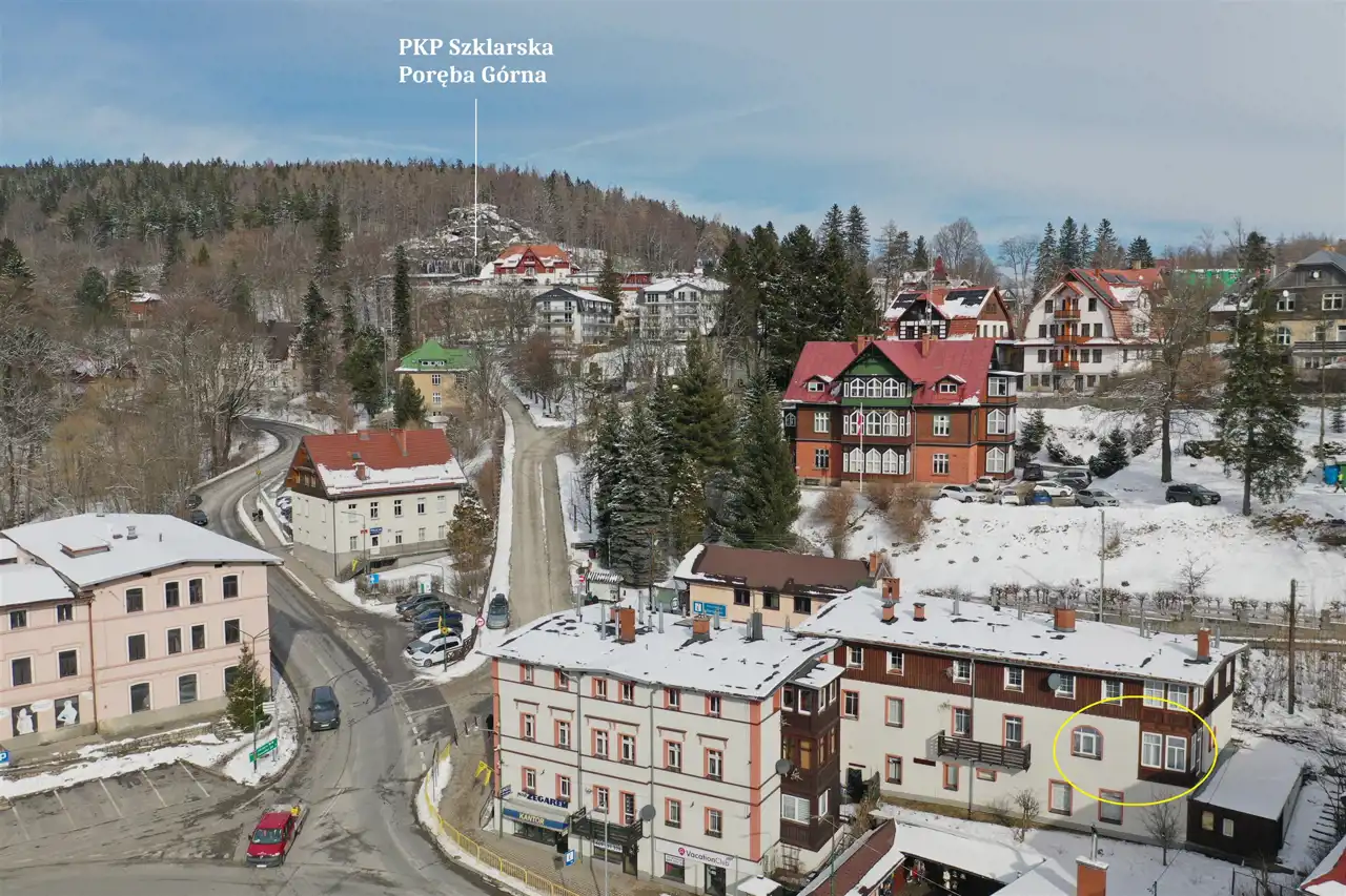 Centrum Szklarskiej Poręby ul. Jedności Narodowej w bliskiej odległości od Stacji Kolejowej PKP Szklarska Poręba Górna, w bliskiej odległości od Parku Esplanada. Szereg udogodnień wokół mieszkania jak: market Lidl, sklepy z pamiątkami, restauracje, dogodny wyjazd w stornę Jakuszyc i Świeradowa Zdroju. W bliskim sąsiedztwie znajduje się również stadion lekkoatletyczny.