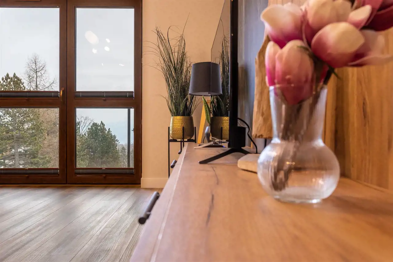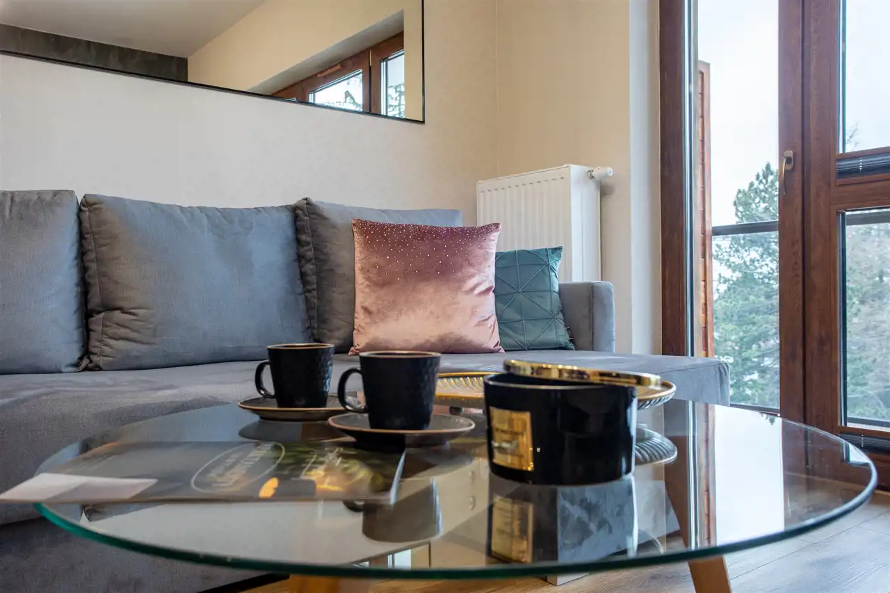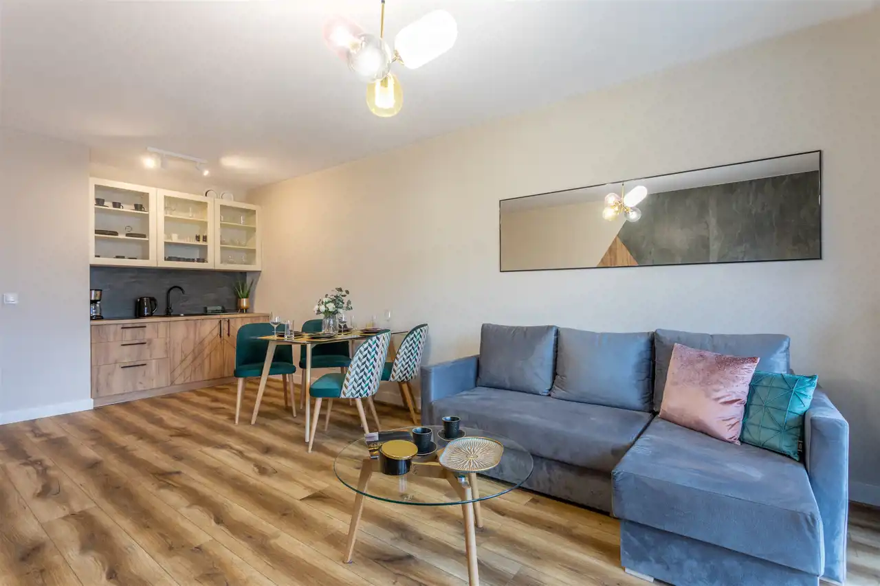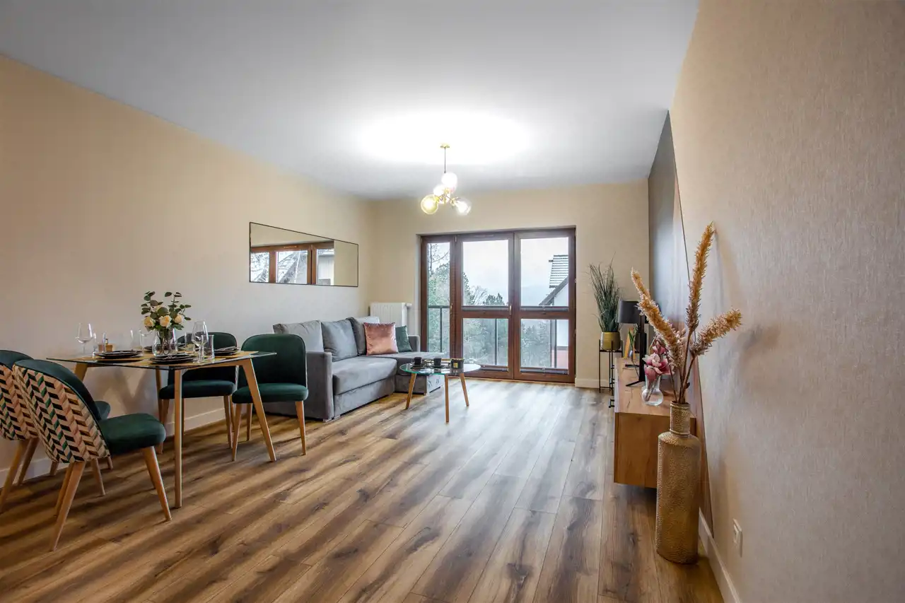 Część dzienna została zaprojektowana jako spójna, komfortowa przestrzeń do wypoczynku. Salon płynnie łączy się z aneksem kuchennym, tworząc miejsce idealne zarówno na prywatne pobyty, jak i na potrzeby najmu krótkoterminowego. Duże przeszklenia zapewniają dobre doświetlenie wnętrza, a wyjście na balkon naturalnie wydłuża strefę dzienną – poranna kawa czy wieczorny odpoczynek z widokiem na góry szybko stają się codziennym rytuałem.