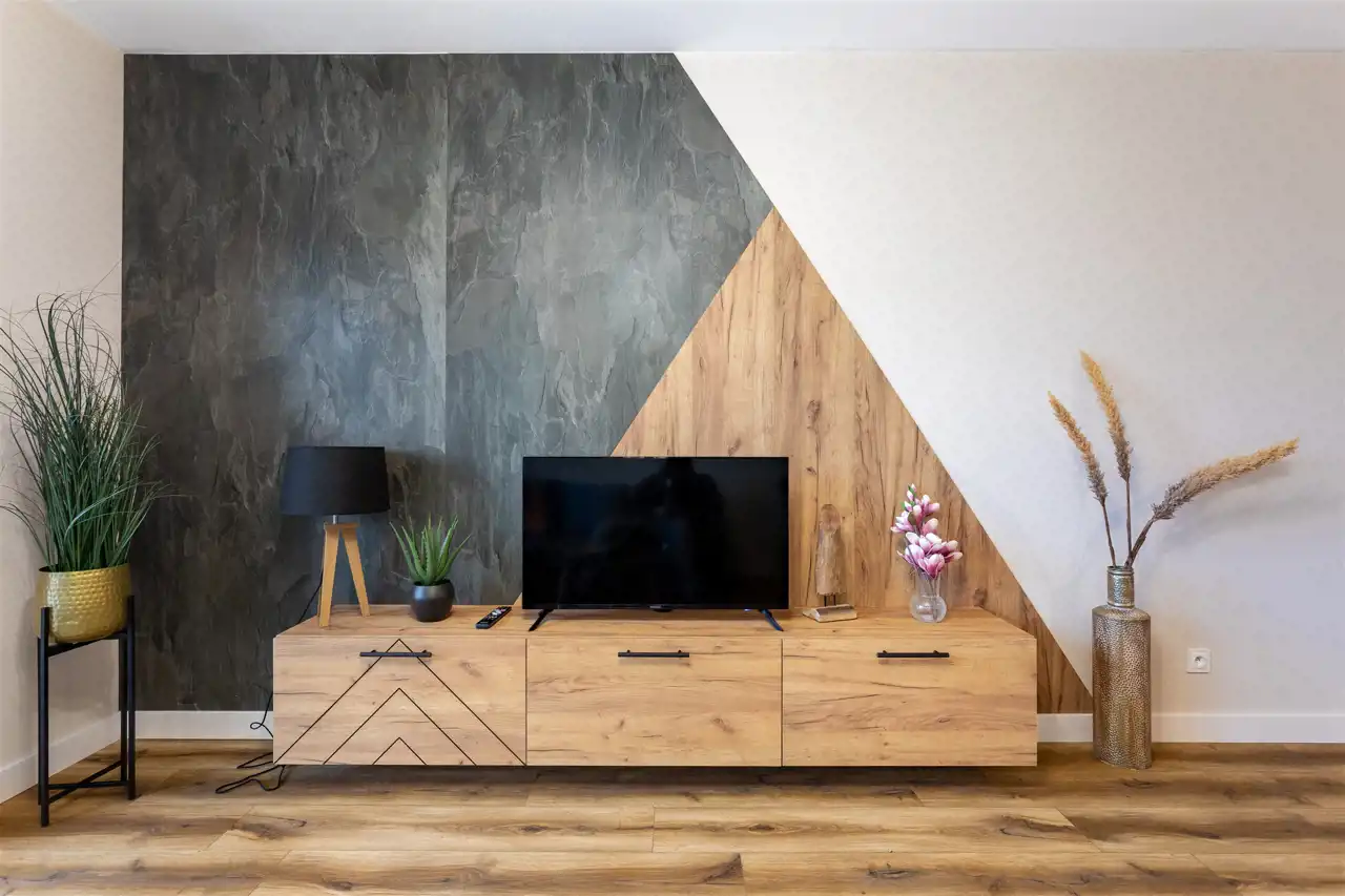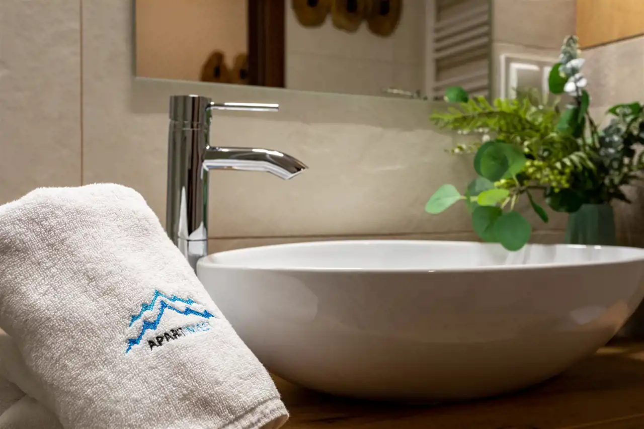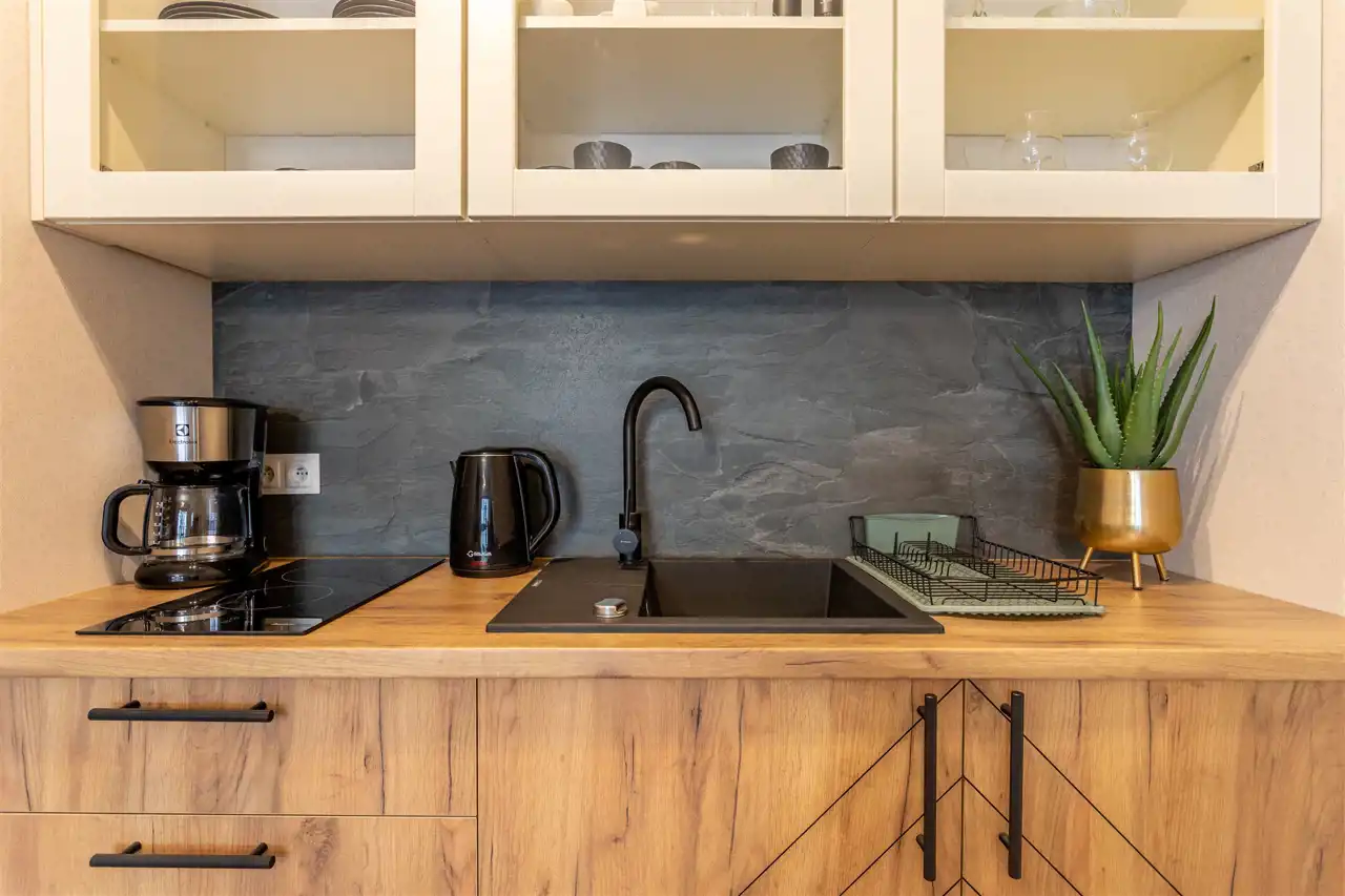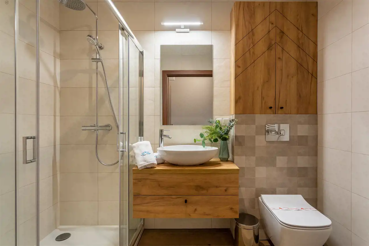 Część dzienna została zaprojektowana jako spójna, komfortowa przestrzeń do wypoczynku. Salon płynnie łączy się z aneksem kuchennym, tworząc miejsce idealne zarówno na prywatne pobyty, jak i na potrzeby najmu krótkoterminowego. Duże przeszklenia zapewniają dobre doświetlenie wnętrza, a wyjście na balkon naturalnie wydłuża strefę dzienną – poranna kawa czy wieczorny odpoczynek z widokiem na góry szybko stają się codziennym rytuałem.