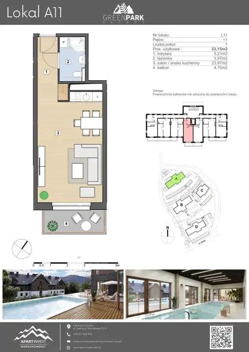 Lokal o powierzchni niespełna 34 m² położony jest na pierwszym piętrze nowoczesnego, kaskadowo zaprojektowanego kompleksu w Szklarska Poręba. Już od wejścia uwagę zwraca jasność wnętrza oraz funkcjonalny układ przestrzeni. Apartament składa się z salonu z aneksem kuchennym, łazienki oraz balkonu.
