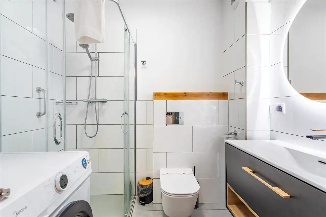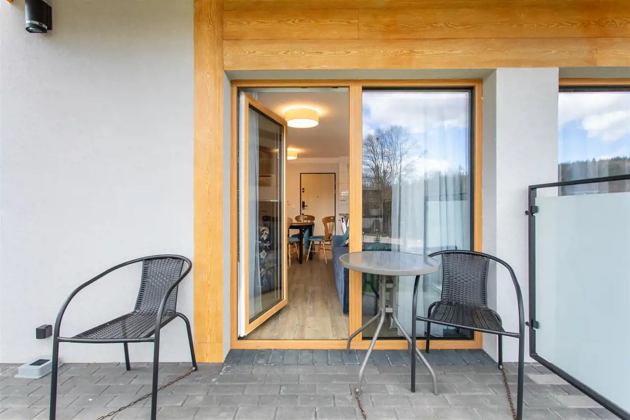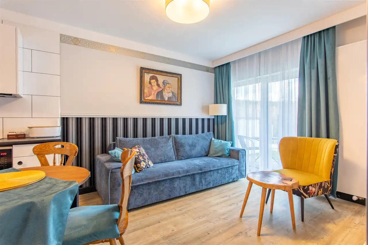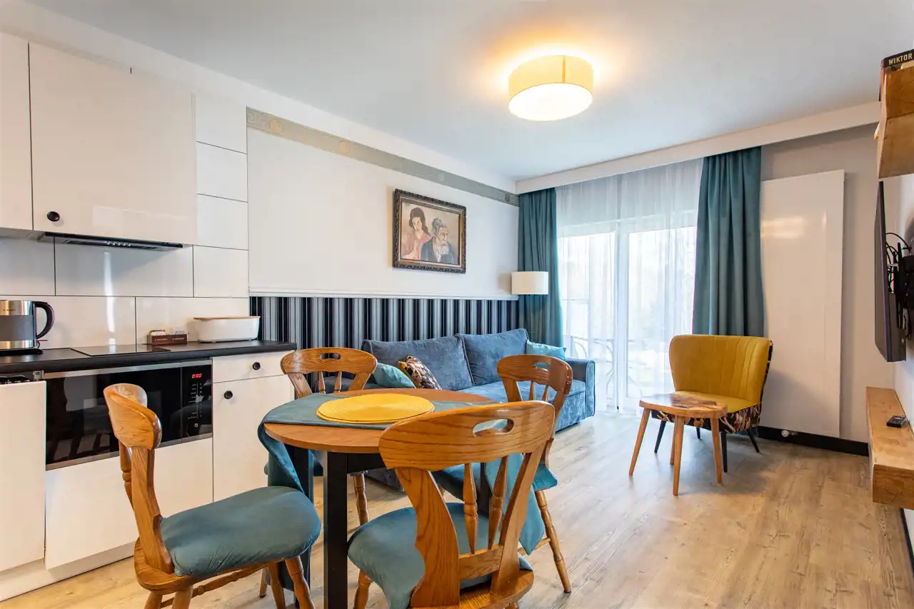 Lokal położony jest na pierwszej kondygnacji nadziemnej i posiada bezpośrednie wyjście na taras – zarówno z salonu, jak i sypialni. Wnętrze obejmuje przestronny przedpokój, dużą łazienkę, część dzienną z aneksem kuchennym oraz sypialnię. Całość została urządzona z dbałością o funkcjonalność i estetykę – w cenie pozostają wszystkie meble i dodatki.