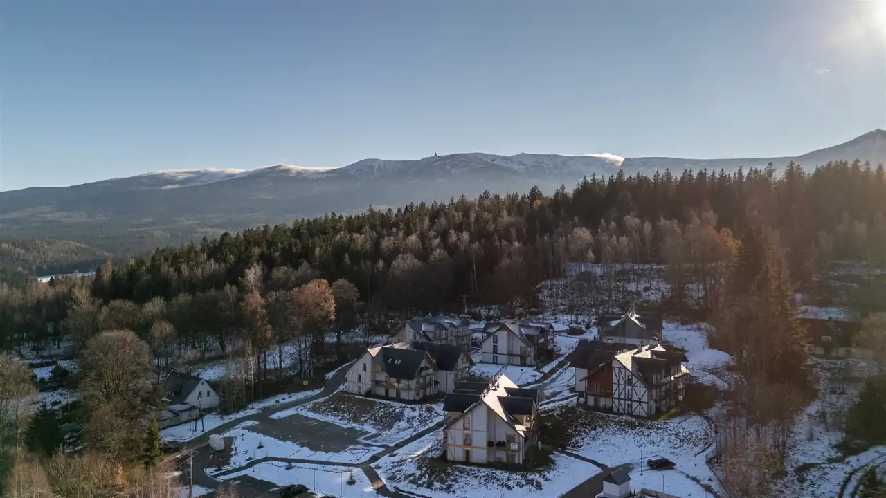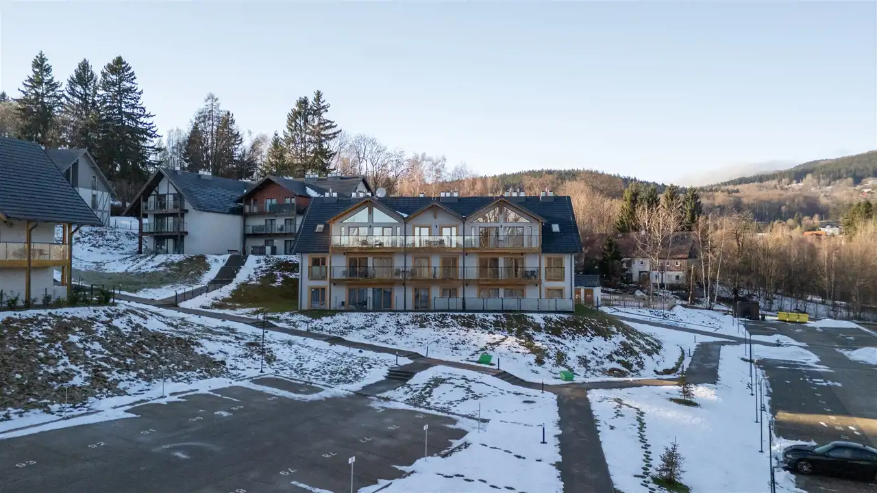 Apartament znajduje się w kameralnej inwestycji, na terenie działki o powierzchni ponad 16 000 m². W jej ramach powstało sześć budynków o architekturze dopasowanej do otoczenia i klimatu Karkonoszy. Całość tworzy spokojne, zielone osiedle, idealne na odpoczynek lub jako baza do wypadów w góry.