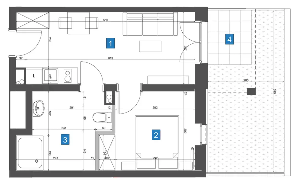 - Charakterystyka mieszkania 34.48 m2, 2 pokoje