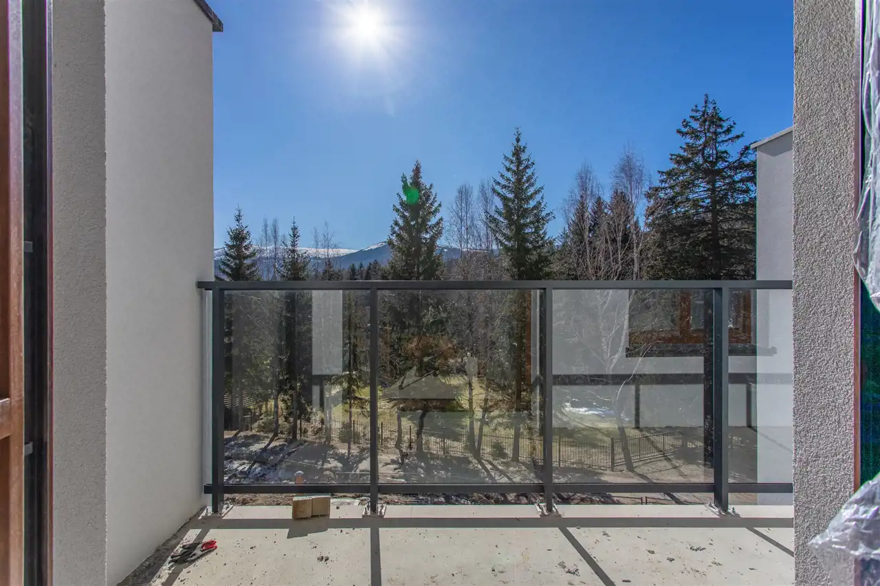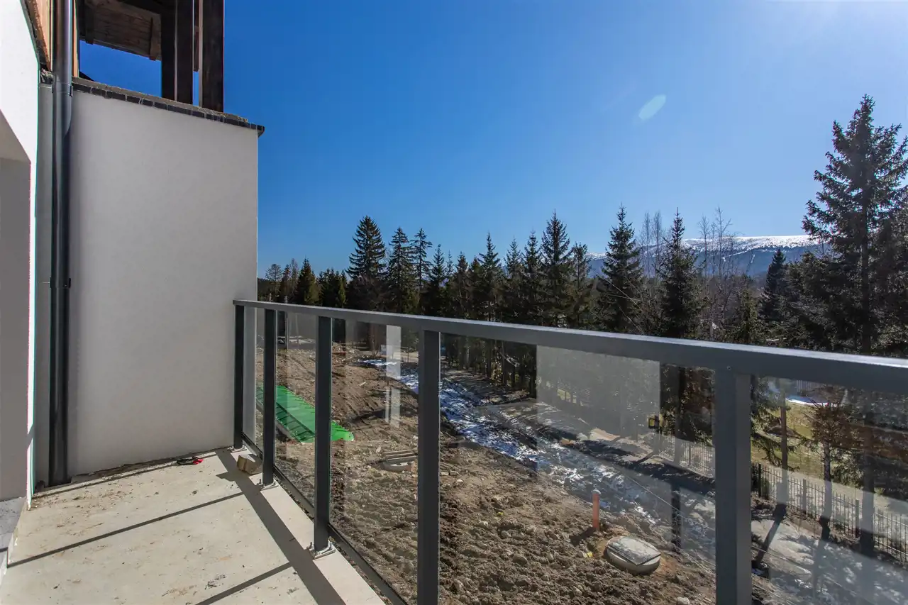Funkcjonalny układ apartamentu obejmuje salon z jadalnią i aneksem kuchennym, oddzielną sypialnię oraz łazienkę. Duże przeszklenia sprawiają, że wnętrze jest jasne i pełne naturalnego światła, a wyjście na sześciometrowy balkon z południową ekspozycją otwiera spektakularny widok na Karkonosze. To miejsce, w którym poranna kawa nabiera wyjątkowego smaku, a zachody słońca pozostają w pamięci na długo.