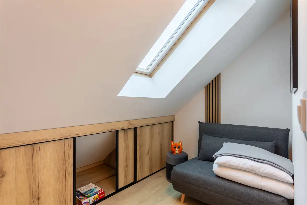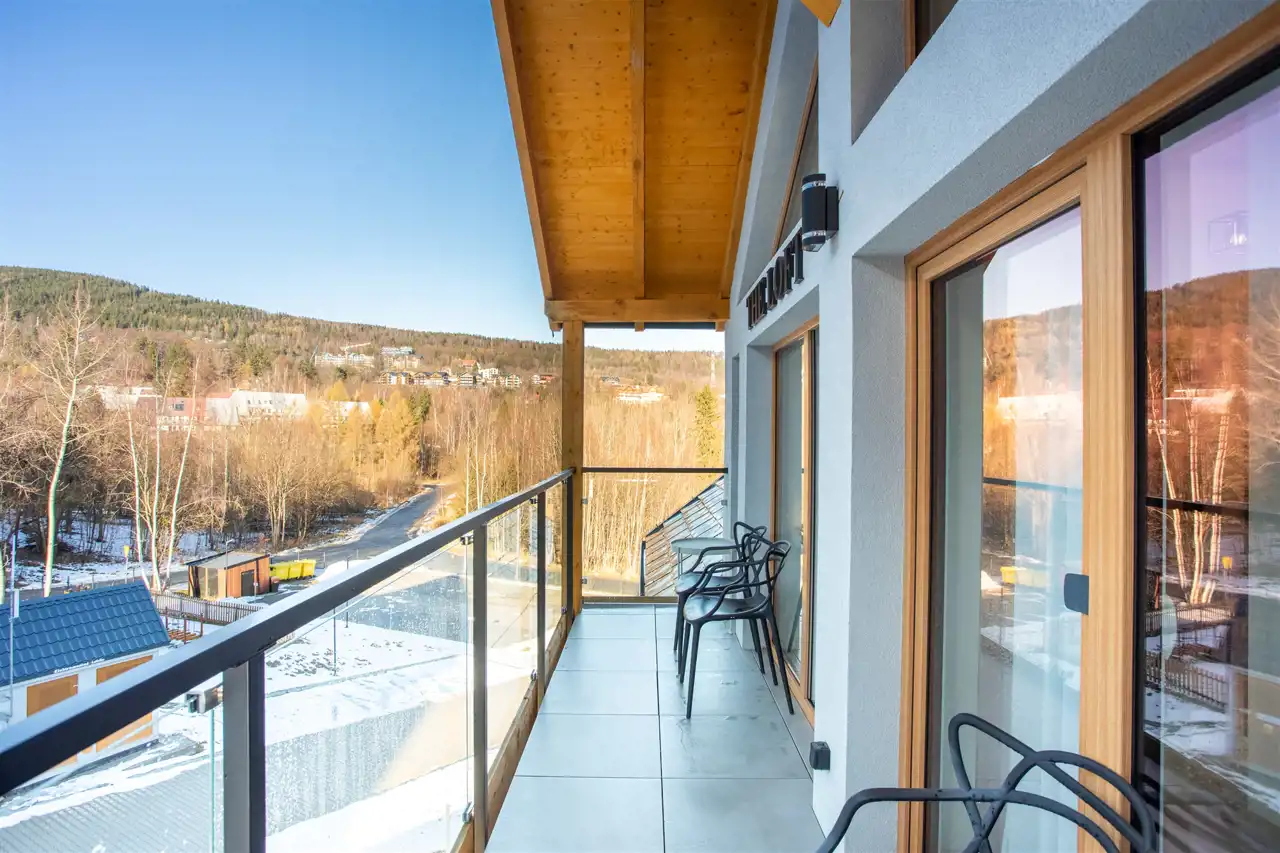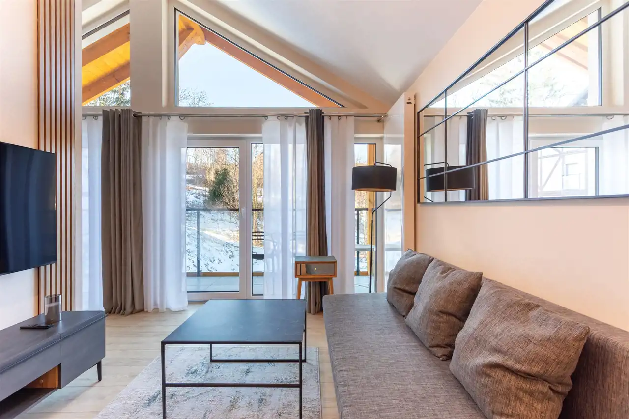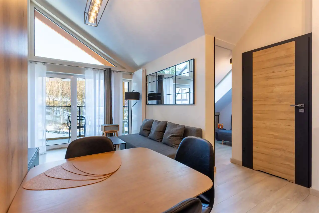 Apartament mieści się na ostatniej kondygnacji kameralnego budynku, będącego częścią zielonego kompleksu składającego się z kilku niskich obiektów harmonijnie wpisanych w karkonoską architekturę. Jasne i dobrze doświetlone pomieszczenia tworzą wyjątkową przestrzeń do wypoczynku - na stosunkowo kompaktowej powierzchni udało się wydzielić część dzienną z aneksem kuchennym, dużą sypialnię oraz drugi, dodatkowy pokój, który może pełnić funkcję sypialni gościnnej lub przestrzeni dla najmłodszych. Wnętrze uzupełnia elegancka łazienka z prysznicem oraz wygodny przedpokój. Duża liczba okien oraz wysoki sufit nadają apartamentowi niepowtarzalnego charakteru, a przestronny balkon z widokiem na góry staje się naturalnym przedłużeniem strefy dziennej.