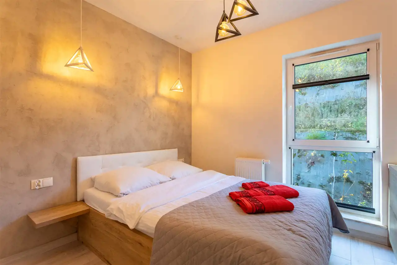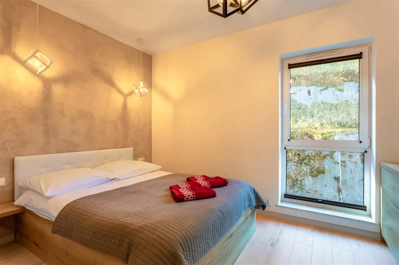 Apartament o powierzchni 48,98 m2 mieści się na drugiej kondygnacji budynku przy ul. Waryńskiego - w spokojnej, zielonej części miasta, a zarazem blisko wszystkich atrakcji turystycznych. Składa się z dwóch sypialni, obydwie wyposażone w duże, małżeńskie łóżka. Łazienka z prysznicem, umywalką, toaletą i miejscem na pralkę zapewnia pełen komfort codziennego użytkowania. Centralnym punktem apartamentu jest pokój dzienny z aneksem kuchennym, jadalnią oraz częścią wypoczynkową. To miejsce stworzone do spotkań, relaksu i wspólnego spędzania czasu. Duże przeszklenia to gwarancja poczucia bliskości z naturą. Z pokoju dziennego prowadzi wyjście na przestronny balkon - idealny na poranną kawę czy wieczorny odpoczynek w otoczeniu natury.
