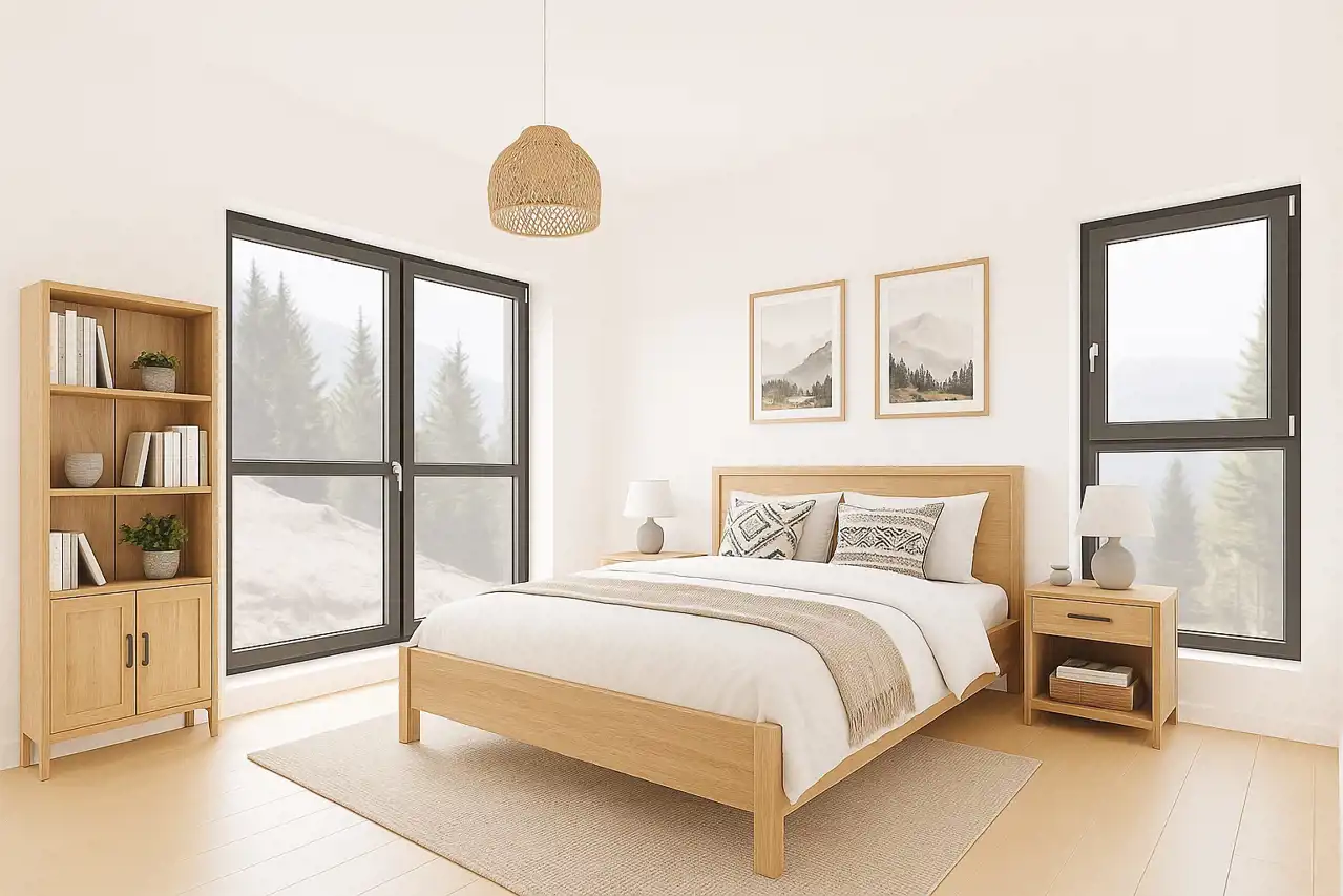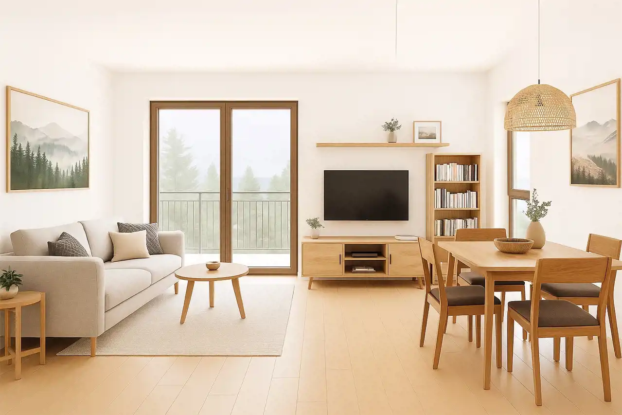 Przemyślany układ wnętrza obejmuje przestronny salon z aneksem kuchennym, który naturalnie łączy się ze strefą wypoczynkową, oddzielną sypialnię, funkcjonalny korytarz oraz komfortową łazienkę. Duże przeszklenia sprawiają, że wnętrze jest pełne światła, a wyjście na balkon pozwala cieszyć się czystym, górskim powietrzem o każdej porze dnia.