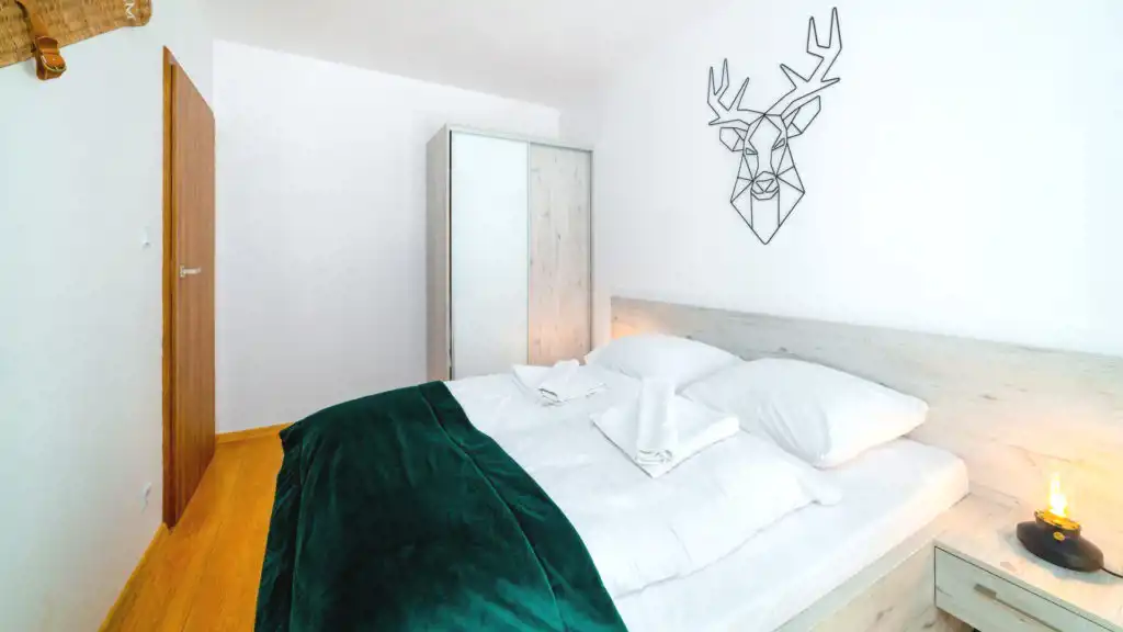 - sypialnia z podwójnym łóżkiem oraz szafą,