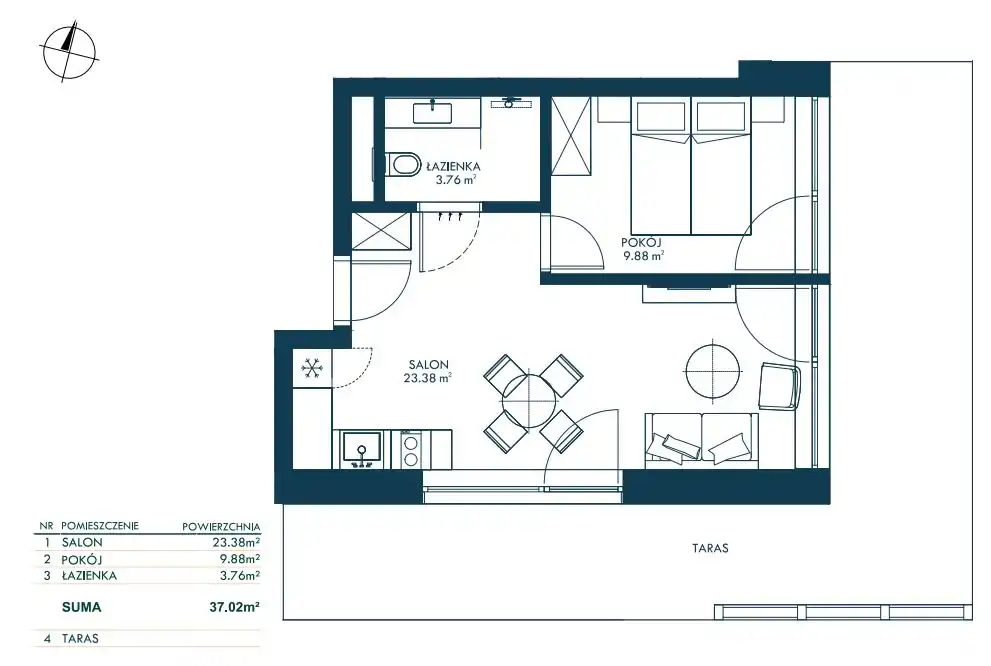 - Charakterystyka mieszkania 37.02 m2, 2 pokoje