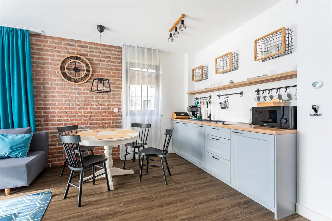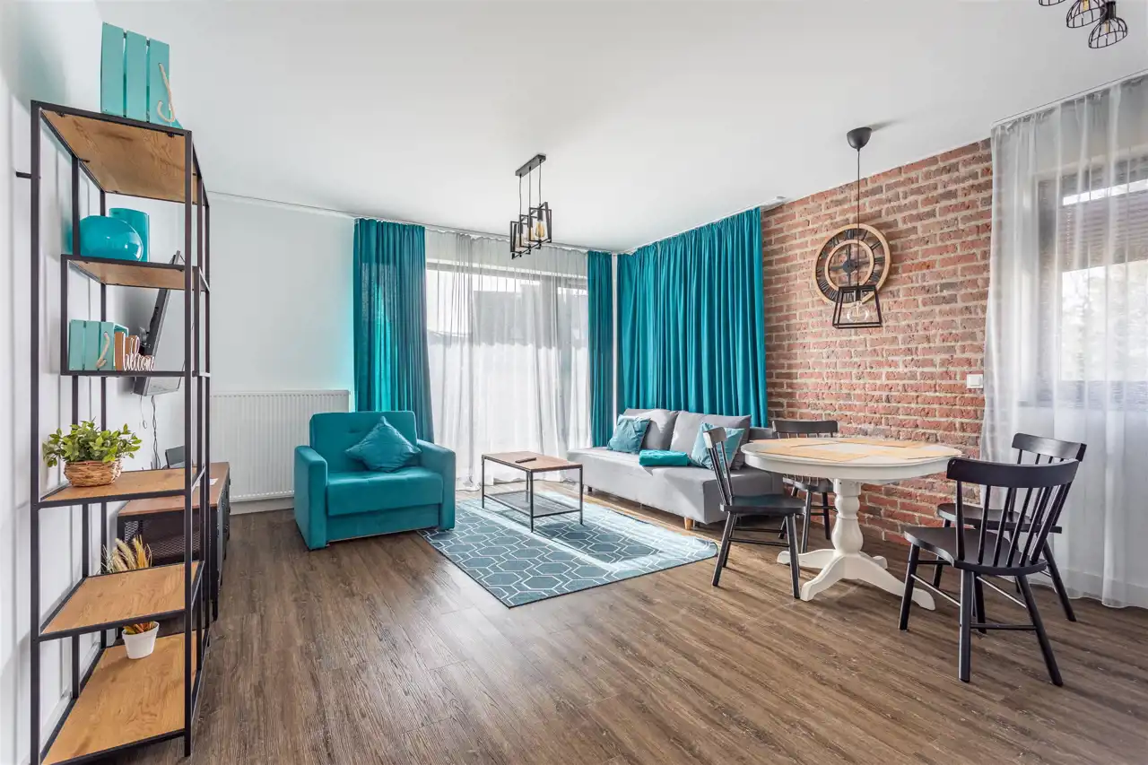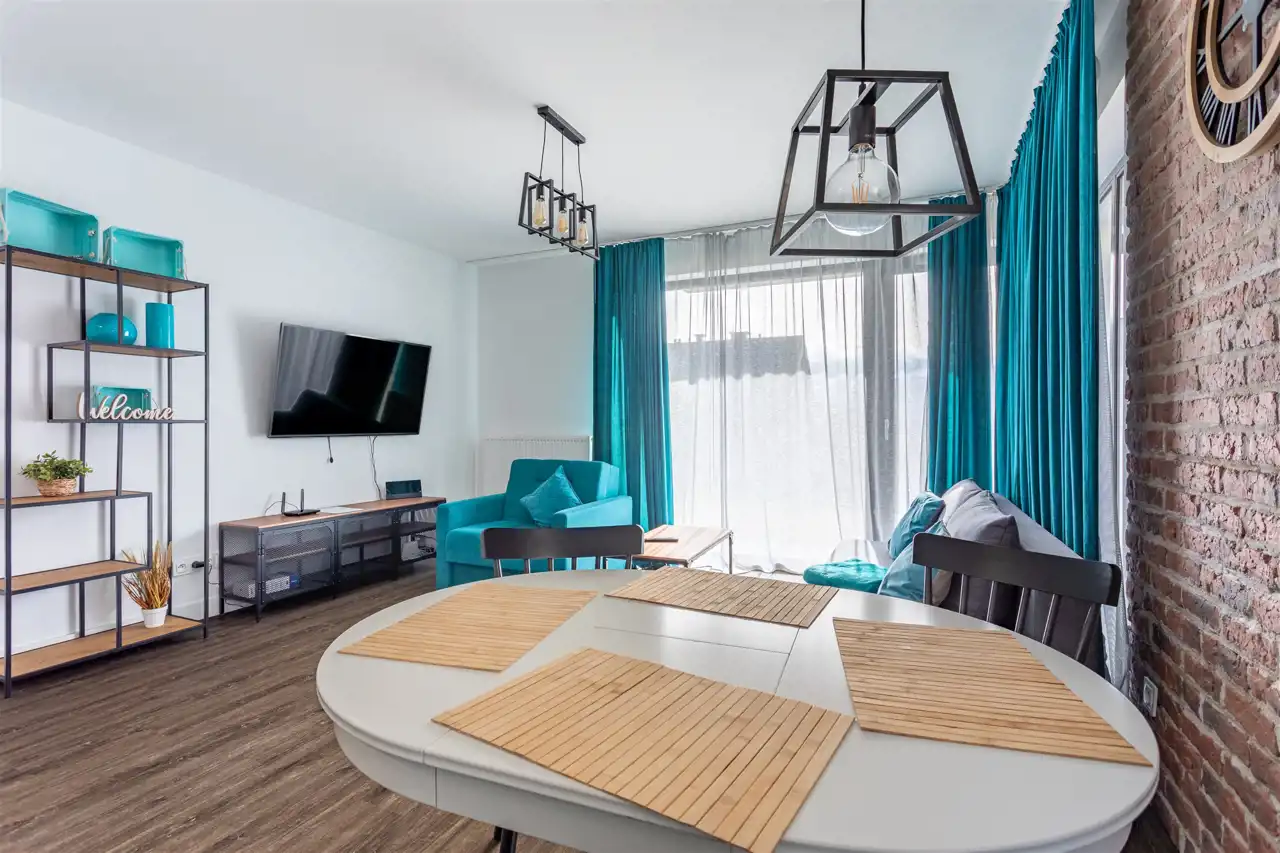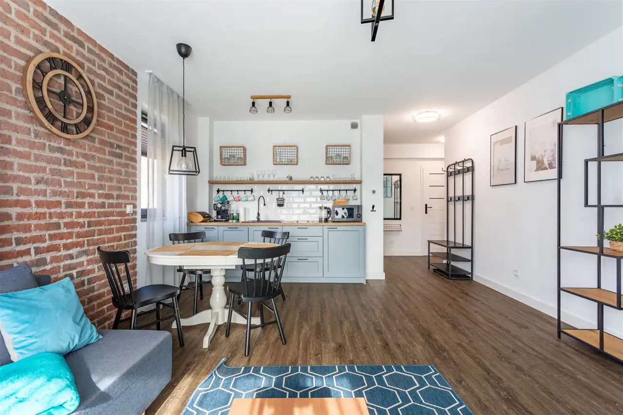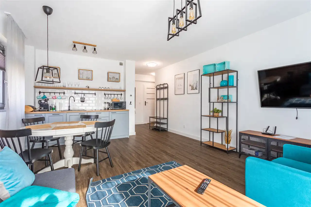 Nieruchomość składa się z dużej przestrzeni dziennej, połączonej z aneksem kuchennym, sypialni, korytarza oraz łazienki. Apartament całkowicie wykończony i wyposażony. Wszystkie meble oraz pozostałe wyposażenie zostają.