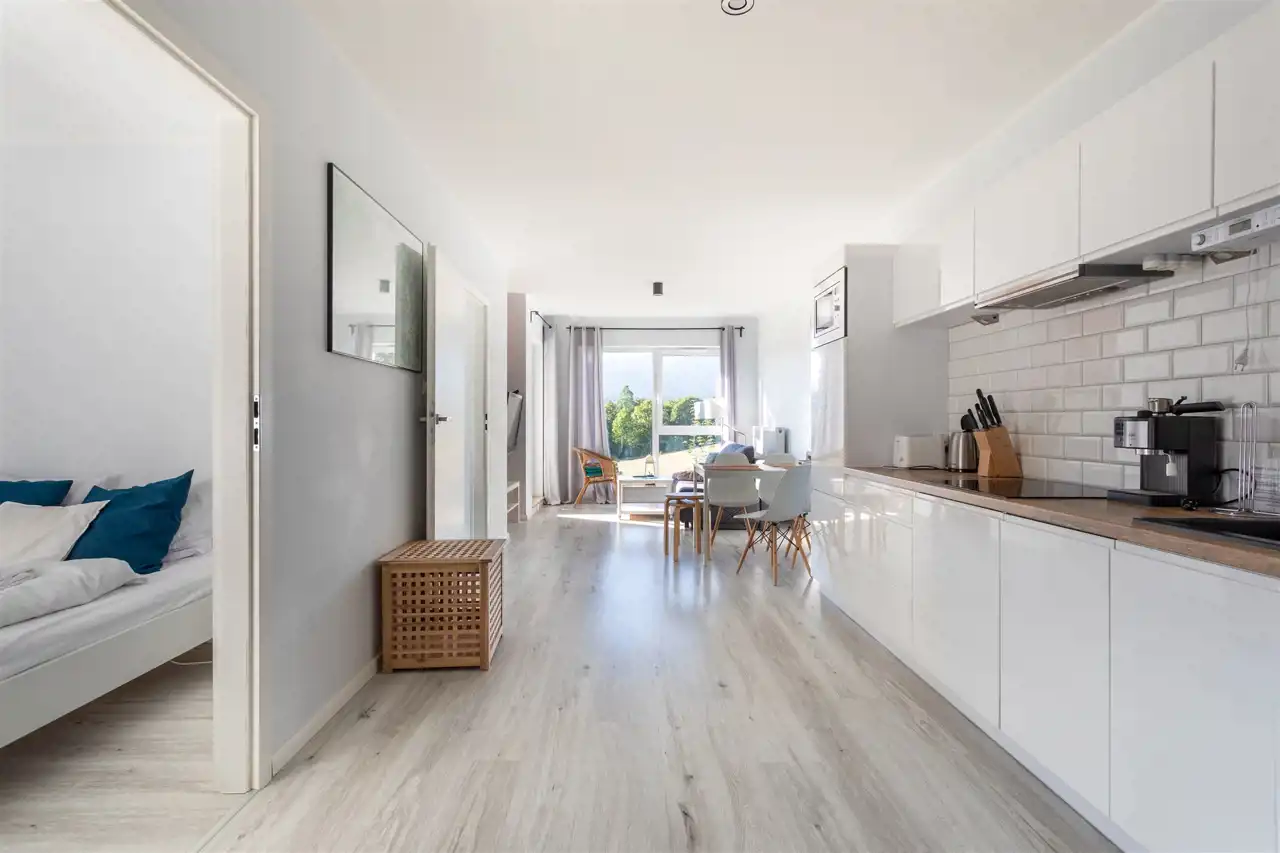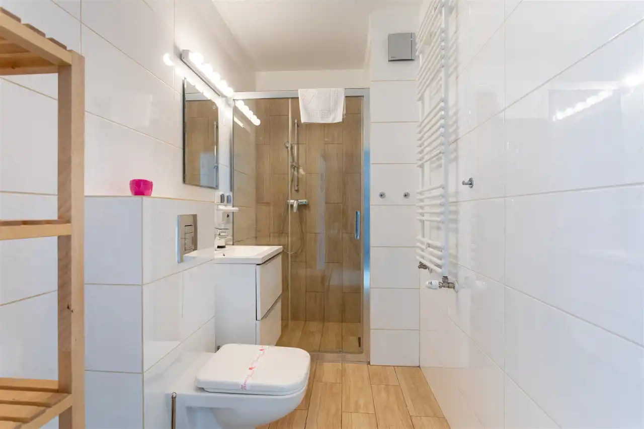 Apartament o powierzchni 55 m2 mieści się na pierwszym piętrze budynku przy ul. Waryńskiego - w spokojnej, zielonej części miasta, a zarazem blisko wszystkich atrakcji turystycznych. Składa się z dwóch sypialni: pierwszej wyposażonej w dwa oddzielne łóżka oraz drugiej z wygodnym łóżkiem małżeńskim. Łazienka z prysznicem, umywalką, toaletą i miejscem na pralkę zapewnia pełen komfort codziennego użytkowania. Centralnym punktem apartamentu jest słoneczny pokój dzienny z aneksem kuchennym, jadalnią oraz częścią wypoczynkową. To miejsce stworzone do spotkań, relaksu i wspólnego spędzania czasu. Ogromne okna od strony południowej oraz wschodniej zalewają wnętrze światłem i otwierają widok na malownicze łąki oraz majestatyczną panoramę Karkonoszy. Z pokoju dziennego prowadzi wyjście na przestronny balkon - idealny na poranną kawę czy wieczorny odpoczynek w otoczeniu natury.