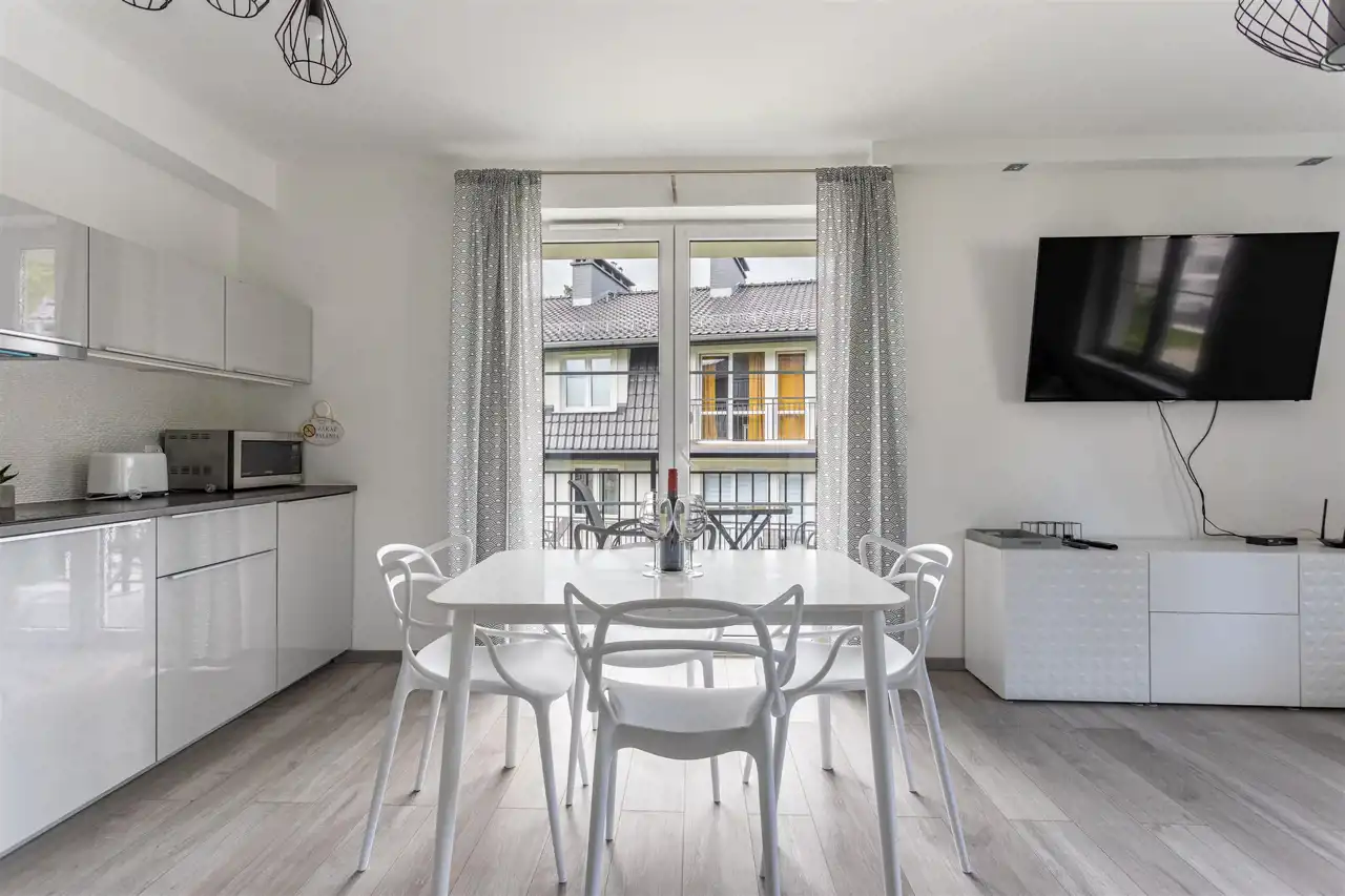 Lokal składa się z korytarza, sypialni, przestronnej łazienki oraz salonu połączonego z aneksem kuchennym i strefą wypoczynkową. Przemyślany układ, w tym wejście do łazienki bezpośrednio z korytarza, zapewnia wygodę użytkowania zarówno dla 2, jak i 4 osób. Duża część dzienna sprzyja wspólnemu spędzaniu czasu, a wyjście na balkon stanowi naturalne przedłużenie przestrzeni i pozwala złapać oddech po dniu spędzonym w górach.