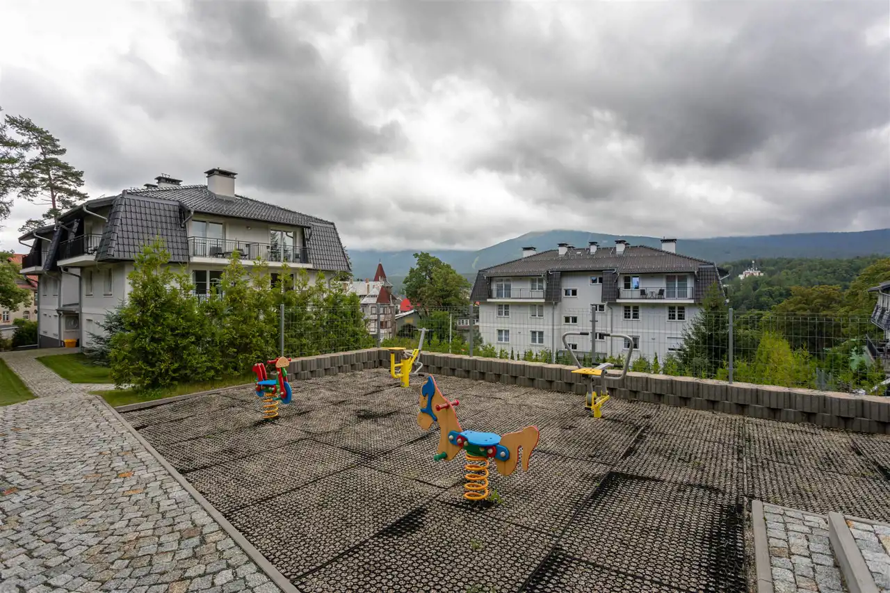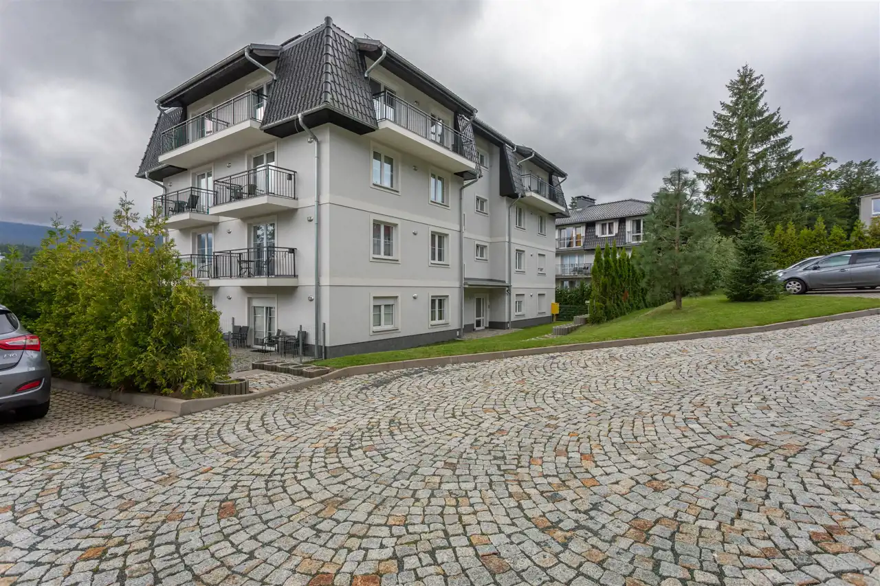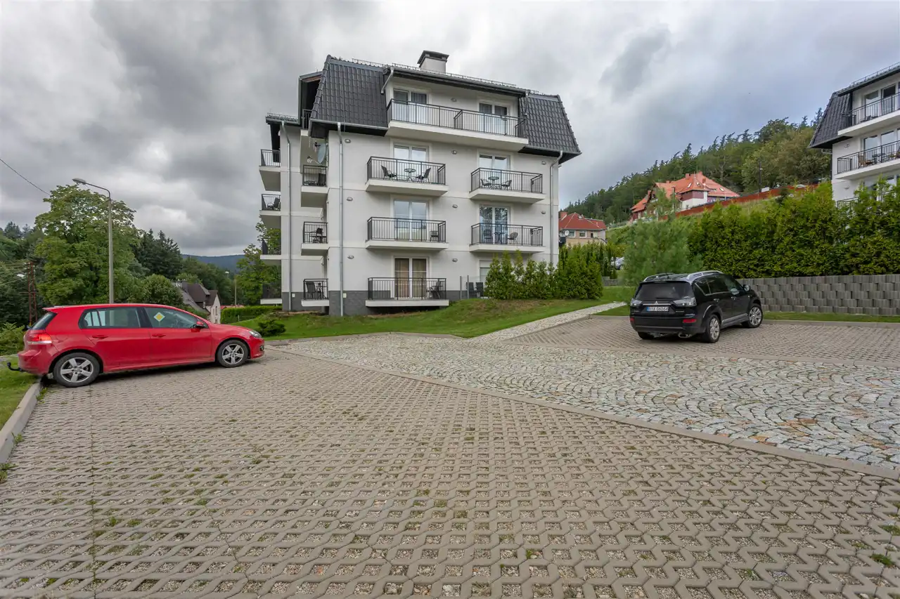 Nieruchomość znajduje się w charakterystycznym kompleksie trzech budynków przy ul. Dworcowej. Do dyspozycji mieszkańców i gości są miejsca parkingowe oraz ogólnodostępny plac zabaw. Lokalizacja jest jednym z największych atutów - tuż obok znajduje się postój taksówek oraz stacja PKP Szklarska Poręba Górna, która z roku na rok zyskuje na znaczeniu jako główny punkt komunikacyjny miasta. Coraz większa liczba turystów wybiera właśnie kolej, co przekłada się bezpośrednio na atrakcyjność tej części miasta pod wynajem.