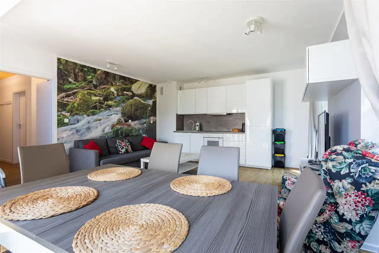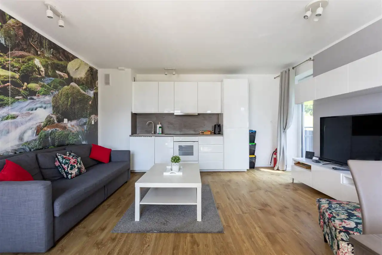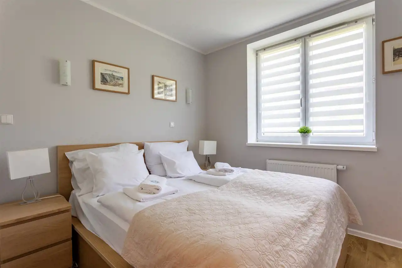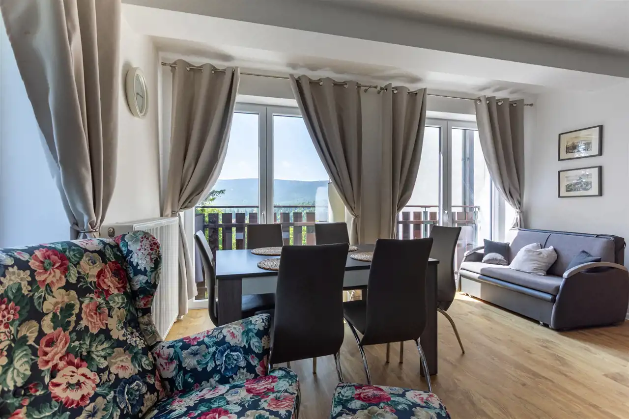 Lokal o powierzchni ponad 40 m² zachwyca funkcjonalnym układem i przestrzenią, która w pełni odpowiada potrzebom zarówno gości turystycznych, jak i właścicieli planujących prywatny wypoczynek w górach. W apartamencie znajduje się duży, jasny przedpokój, przestronna sypialnia, komfortowa łazienka oraz pokój dzienny z oknami wychodzącymi na dwie strony świata, co zapewnia doskonałe doświetlenie i widok na otaczającą zieleń. Dzięki dwóm rozkładanym kanapom w salonie, apartament może komfortowo przyjąć aż 5 osób, co czyni go atrakcyjną alternatywą dla mniejszych, standardowych lokali 2+2.