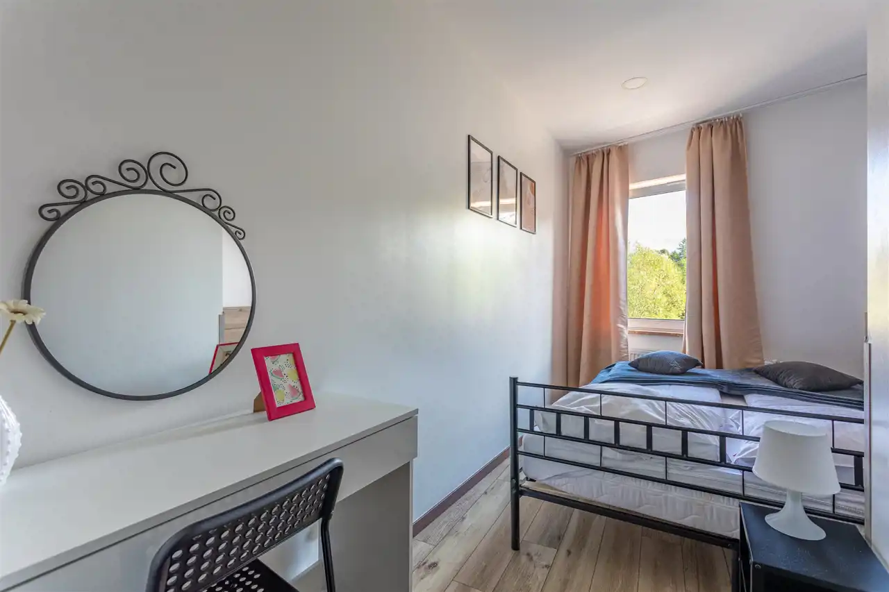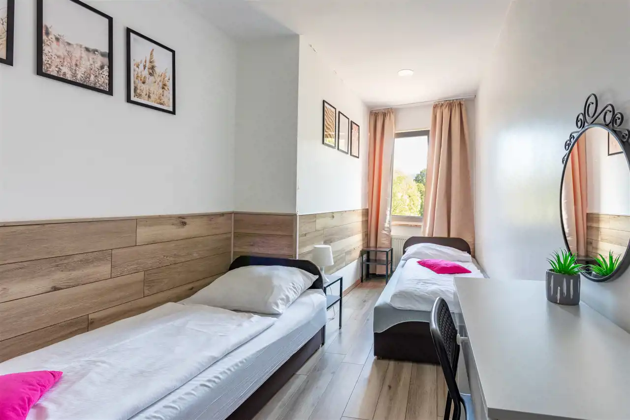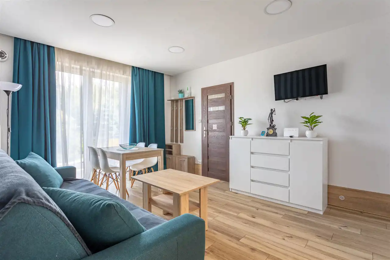 Idealne rozwiązanie dla większych grup. Składa się z dużego pokoju dziennego połączonego z jadalnią i aneksem kuchennym, dwóch sypialni, łazienki oraz korytarza, zapewniając maksymalny komfort nawet dla kilku osób.