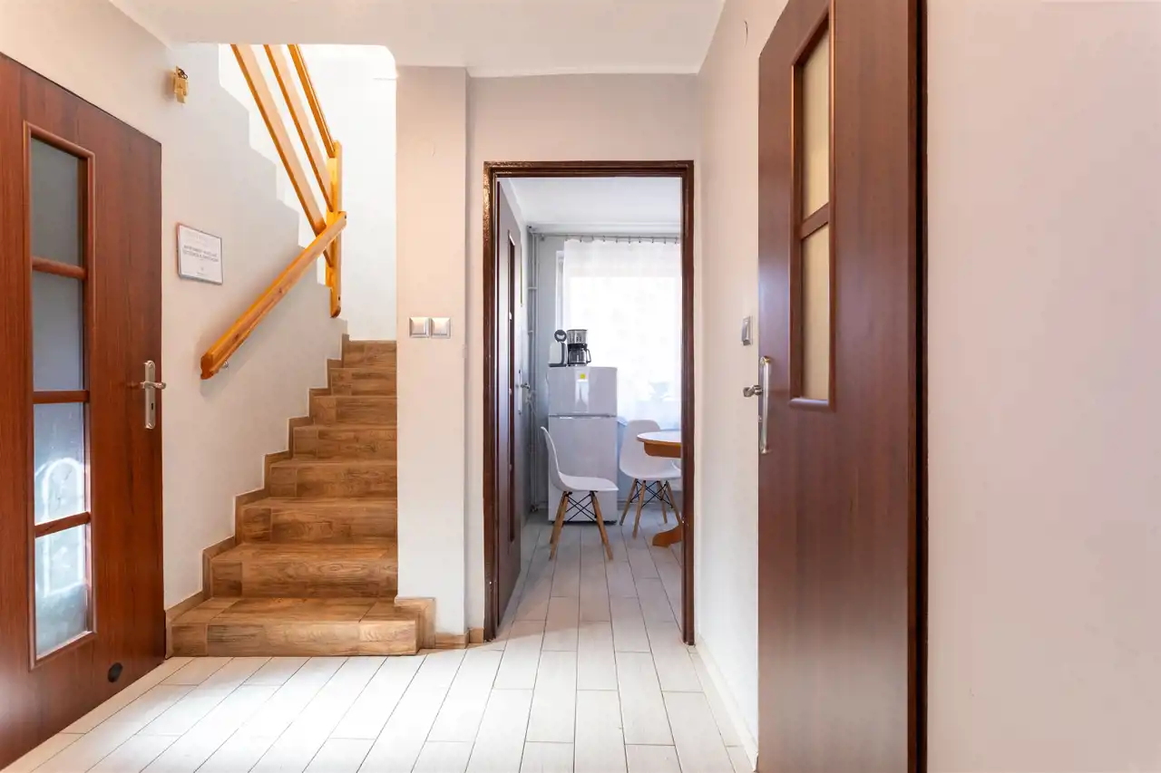 Nieruchomość rozłożona jest na czterech kondygnacjach, co daje wyjątkową funkcjonalność i szerokie możliwości aranżacyjne. Na poziomie parteru znajduje się jasna kuchnia z oknem, łazienka oraz przestronny pokój dzienny z wyjściem na balkon. To właśnie stąd rozciąga się przyjemny widok na Karkonosze oraz na przynależny do lokalu ogródek, który stanowi naturalne przedłużenie strefy wypoczynkowej. Piętro to strefa prywatna, na której znajdują się trzy sypialnie, z czego jedna posiada wyjście na balkon, a także dodatkowe WC, co znacząco podnosi komfort codziennego użytkowania.