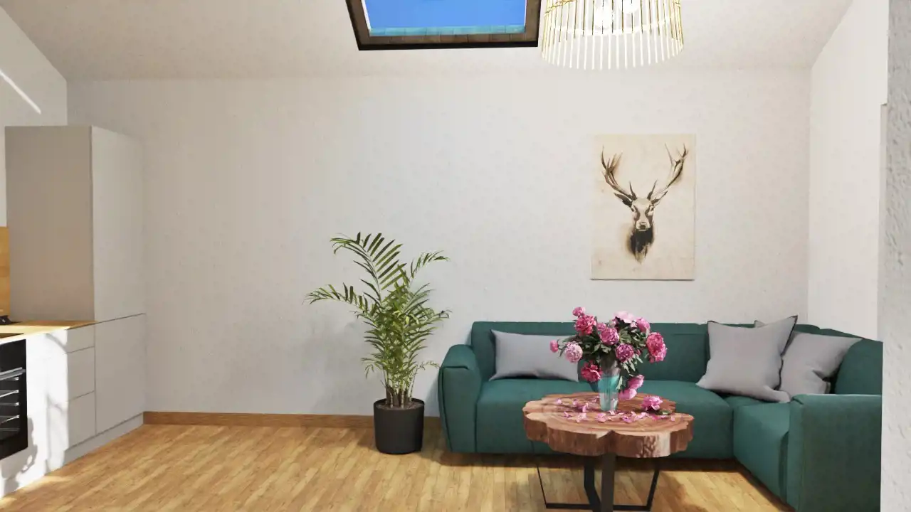 Z racji na brak strychu, w lokalu zyskujemy przestrzeń ze względu na wysokość - najwyższy punkt to ok. 4,5m.