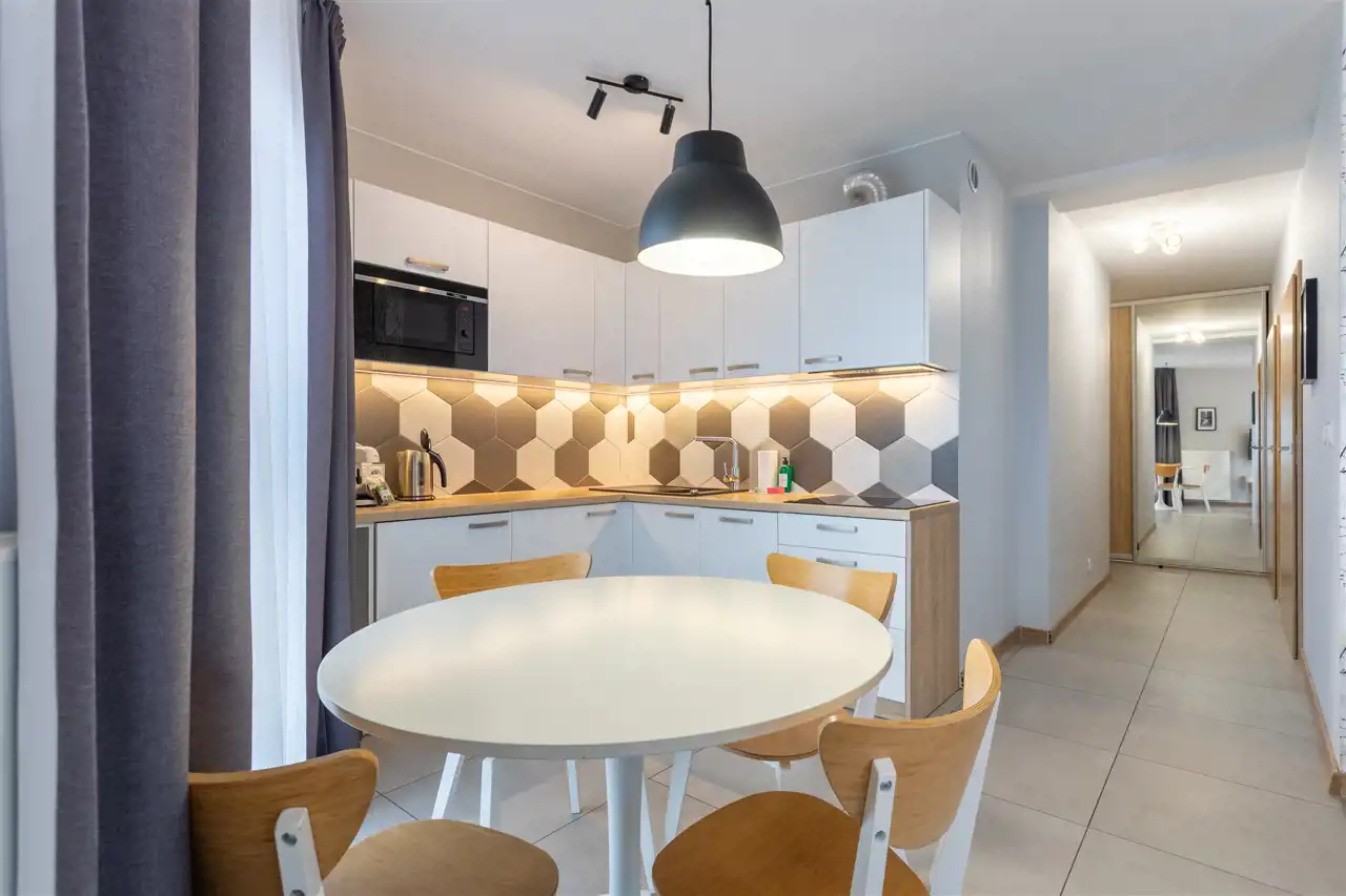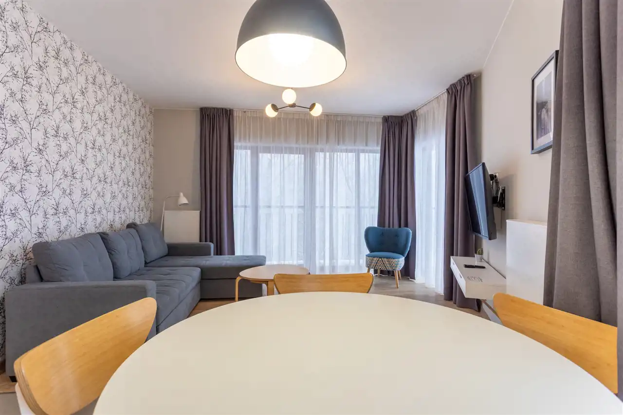 Układ mieszkania został zaplanowany w sposób bardzo funkcjonalny. Apartament składa się z przestronnego pokoju dziennego z aneksem kuchennym, dwóch niezależnych sypialni, łazienki oraz korytarza. Część dzienna tworzy jasną, otwartą przestrzeń sprzyjającą wspólnemu spędzaniu czasu. Duże przeszklenia zapewniają doskonałe doświetlenie wnętrza, a widok na pasmo Karkonoszy buduje wyjątkowy klimat tego miejsca i podkreśla jego górski charakter.