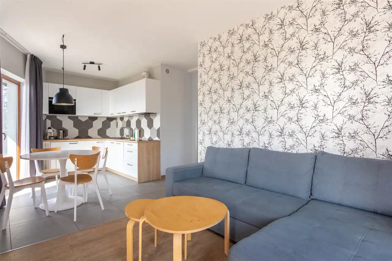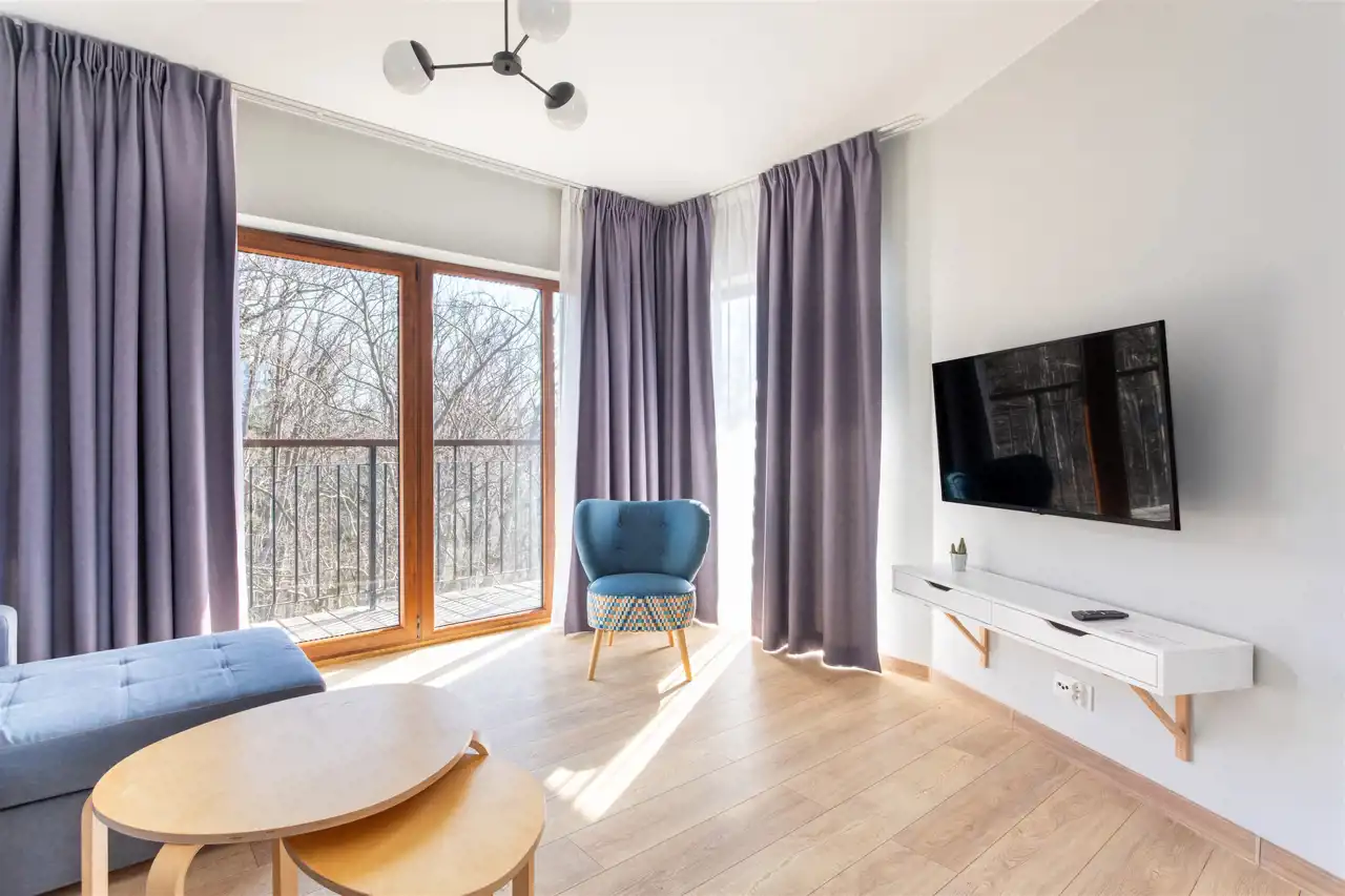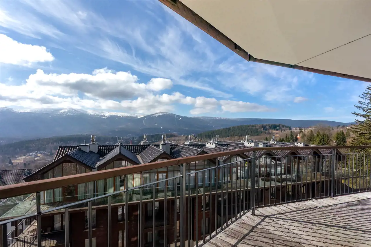 Układ mieszkania został zaplanowany w sposób bardzo funkcjonalny. Apartament składa się z przestronnego pokoju dziennego z aneksem kuchennym, dwóch niezależnych sypialni, łazienki oraz korytarza. Część dzienna tworzy jasną, otwartą przestrzeń sprzyjającą wspólnemu spędzaniu czasu. Duże przeszklenia zapewniają doskonałe doświetlenie wnętrza, a widok na pasmo Karkonoszy buduje wyjątkowy klimat tego miejsca i podkreśla jego górski charakter.