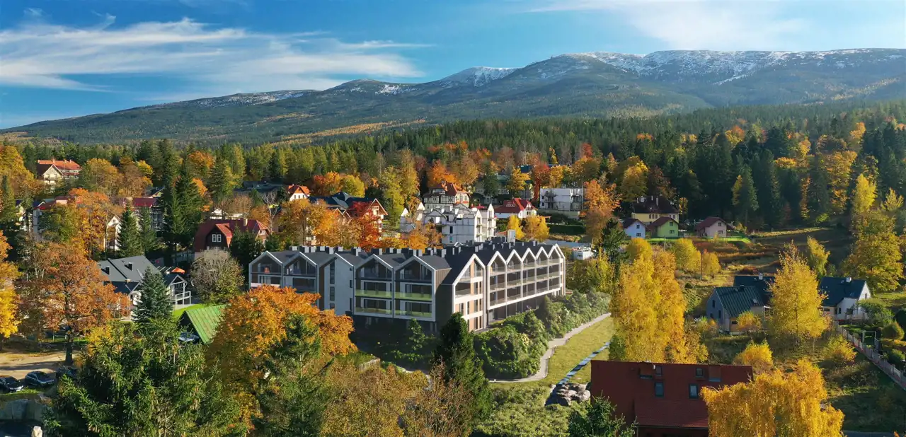 Apartamenty Belle View to nowy budynek apartamentowy w samym centrum Szklarskiej Poręby tuż przy nowo budowanym deptaku, który znajduje się zaledwie 250 metrów od budynku.
