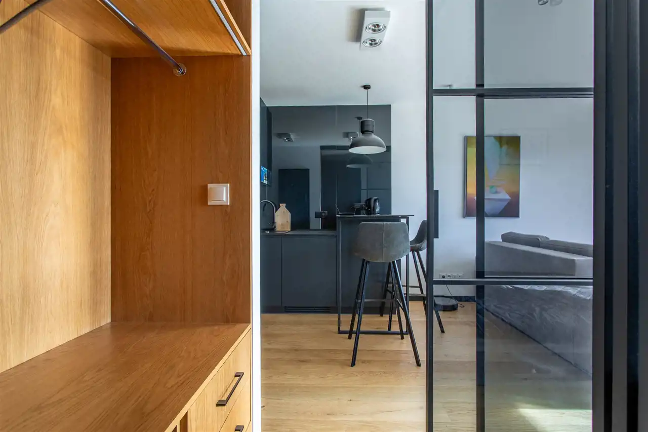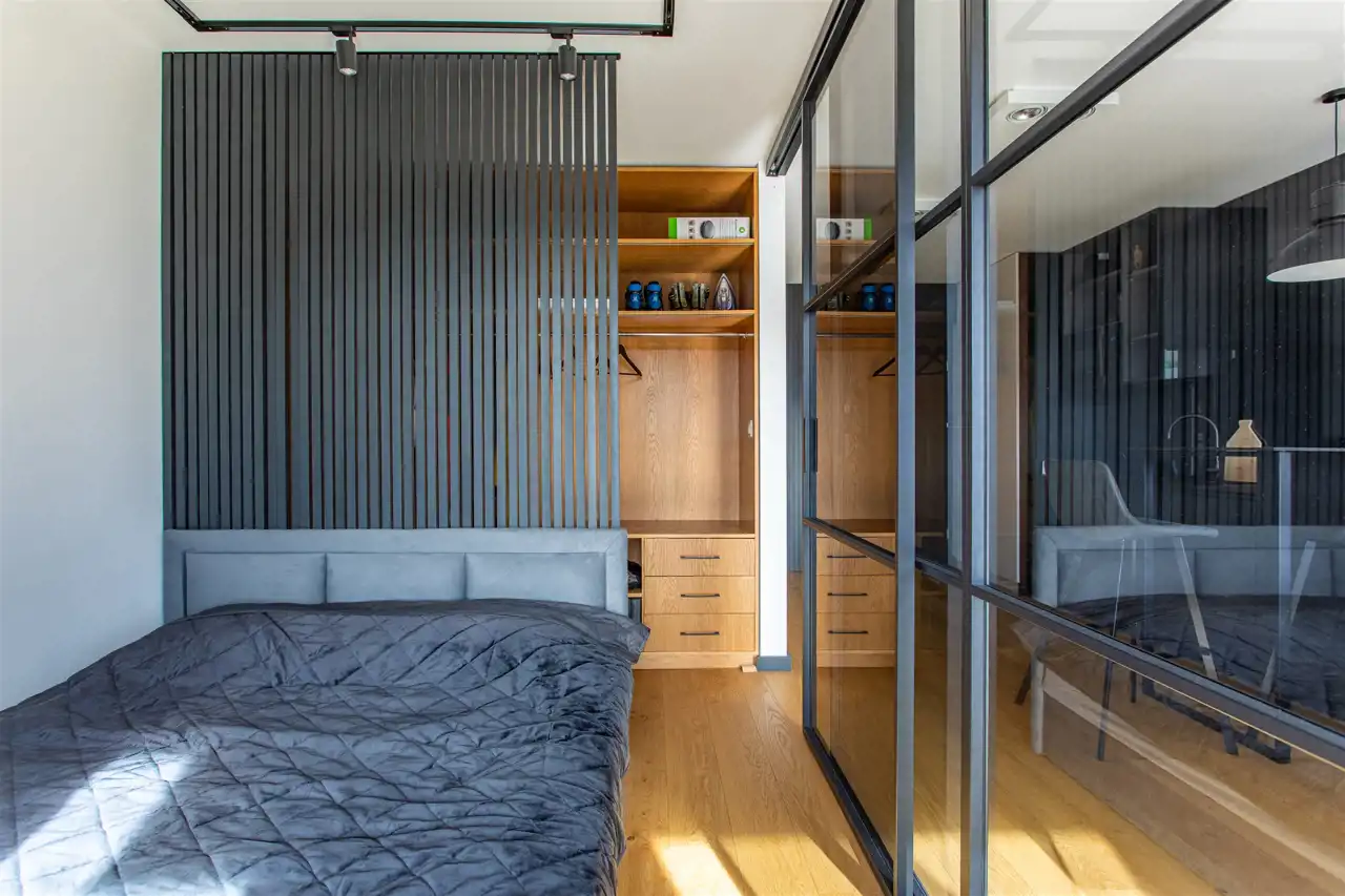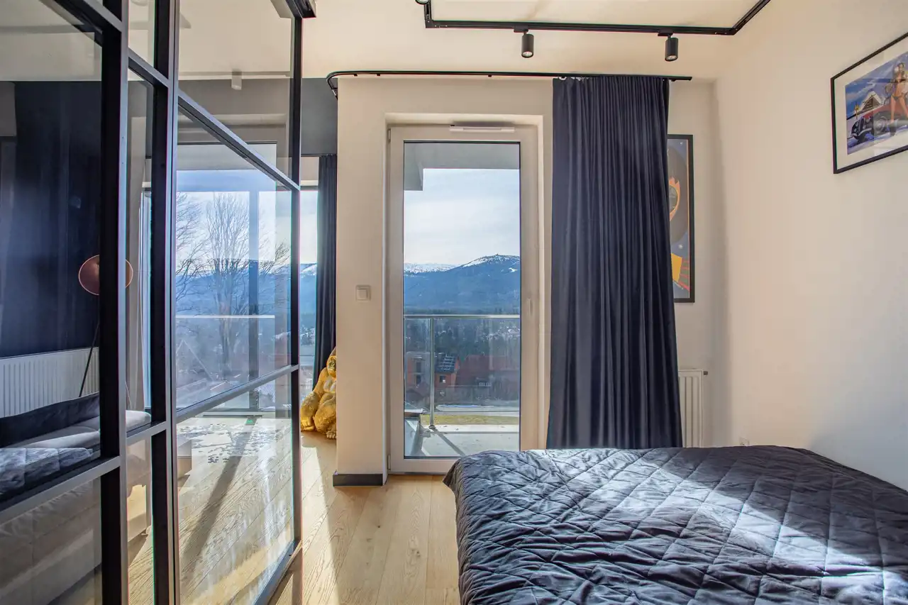 Dzięki przemyślanej modernizacji, udało się wydzielić komfortową sypialnię z garderobą, zachowując przy tym przestronność całego apartamentu. Przeszklenia między częścią dzienną a sypialnią zapewniają optymalne doświetlenie wnętrza, a wyjście na balkon dostępne z obu pomieszczeń sprawia, że jeszcze łatwiej można cieszyć się zachwycającym pejzażem górskim o każdej porze dnia.