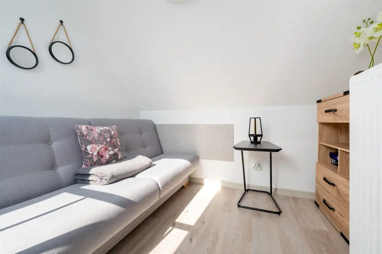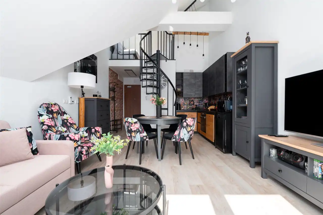 Nieruchomość znajduje się na trzecim piętrze i składa się z przestronnego salonu z aneksem kuchennym oraz sypialni usytuowanej na antresoli.