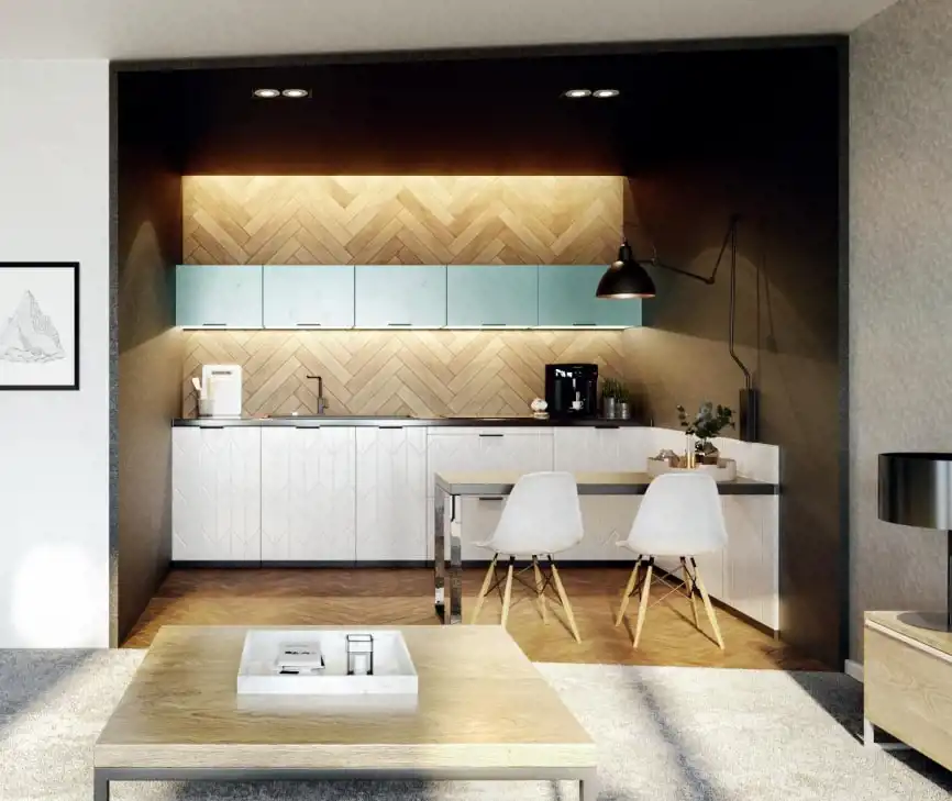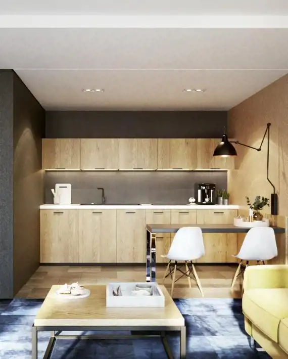 Każdy apartament posiada własny aneks kuchenny, przestronne okna zapewniające maksimum doświetlenia.