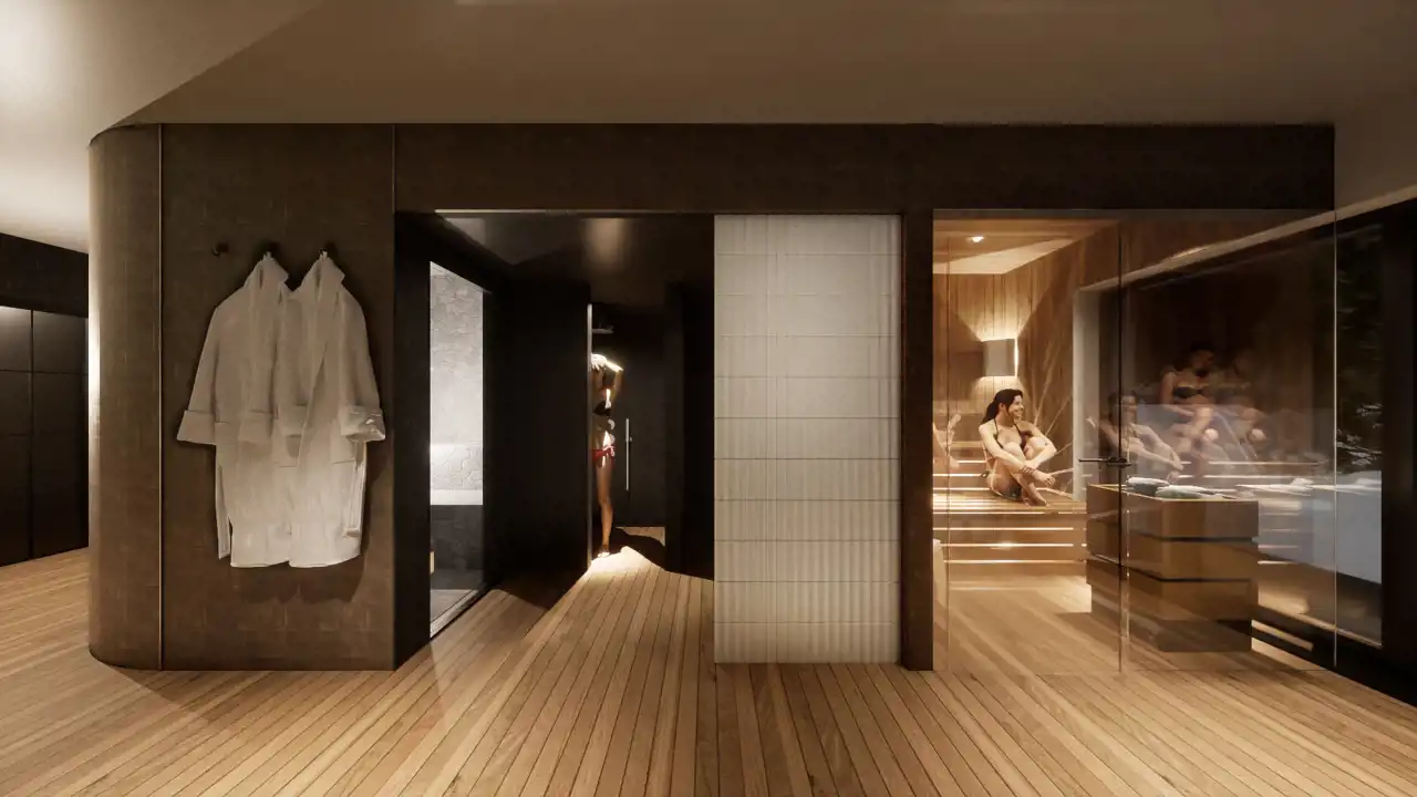 W budynku zaprojektowana jest część SPA w którą wchodzą sauny suche, jacuzzi, przebieralnie ponadto w budynku zaprojektowany jest PLAY Room dla najmłodszych.