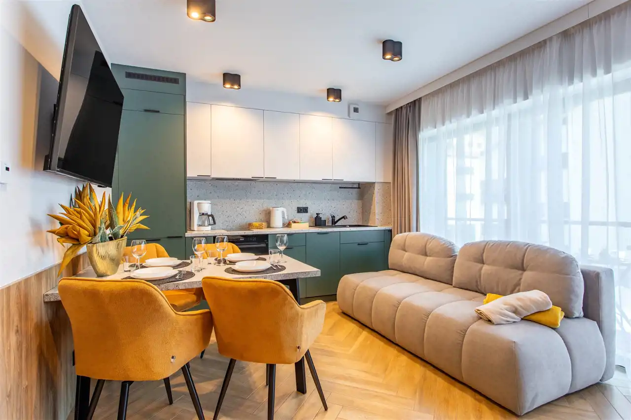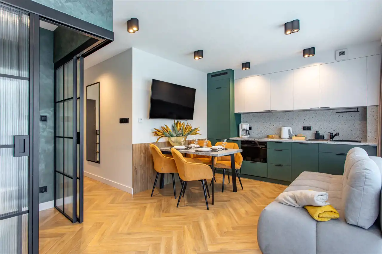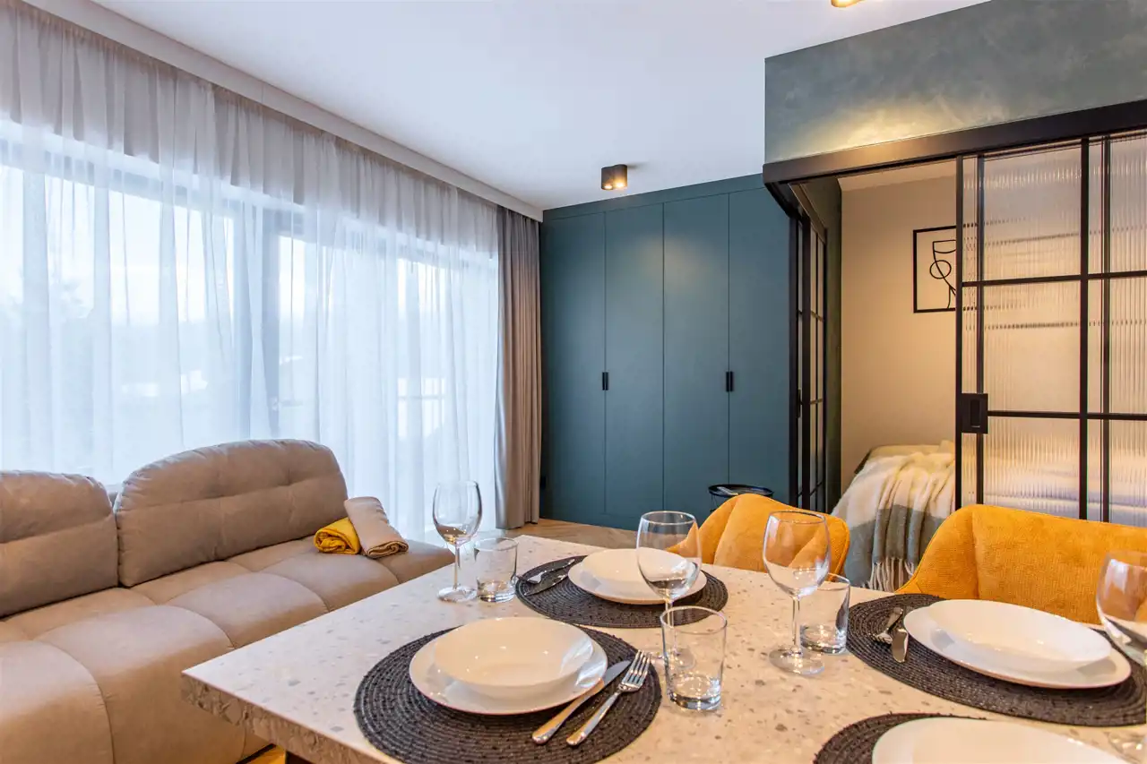 Lokal o powierzchni ponad 40 m² został wykończony z dbałością o detale, przy użyciu wysokiej klasy materiałów. Na funkcjonalną przestrzeń apartamentu składa się przestronny korytarz, duża sypialnia z balkonem, przemyślana łazienka oraz przestronny pokój dzienny z aneksem kuchennym i wyjściem na drugi balkon. Dzięki wygospodarowaniu dodatkowej, wydzielonej strefy sypialnianej w salonie, apartament może komfortowo pomieścić do 6 osób, co znacząco zwiększa jego potencjał inwestycyjny na tle standardowych lokali 2+2.