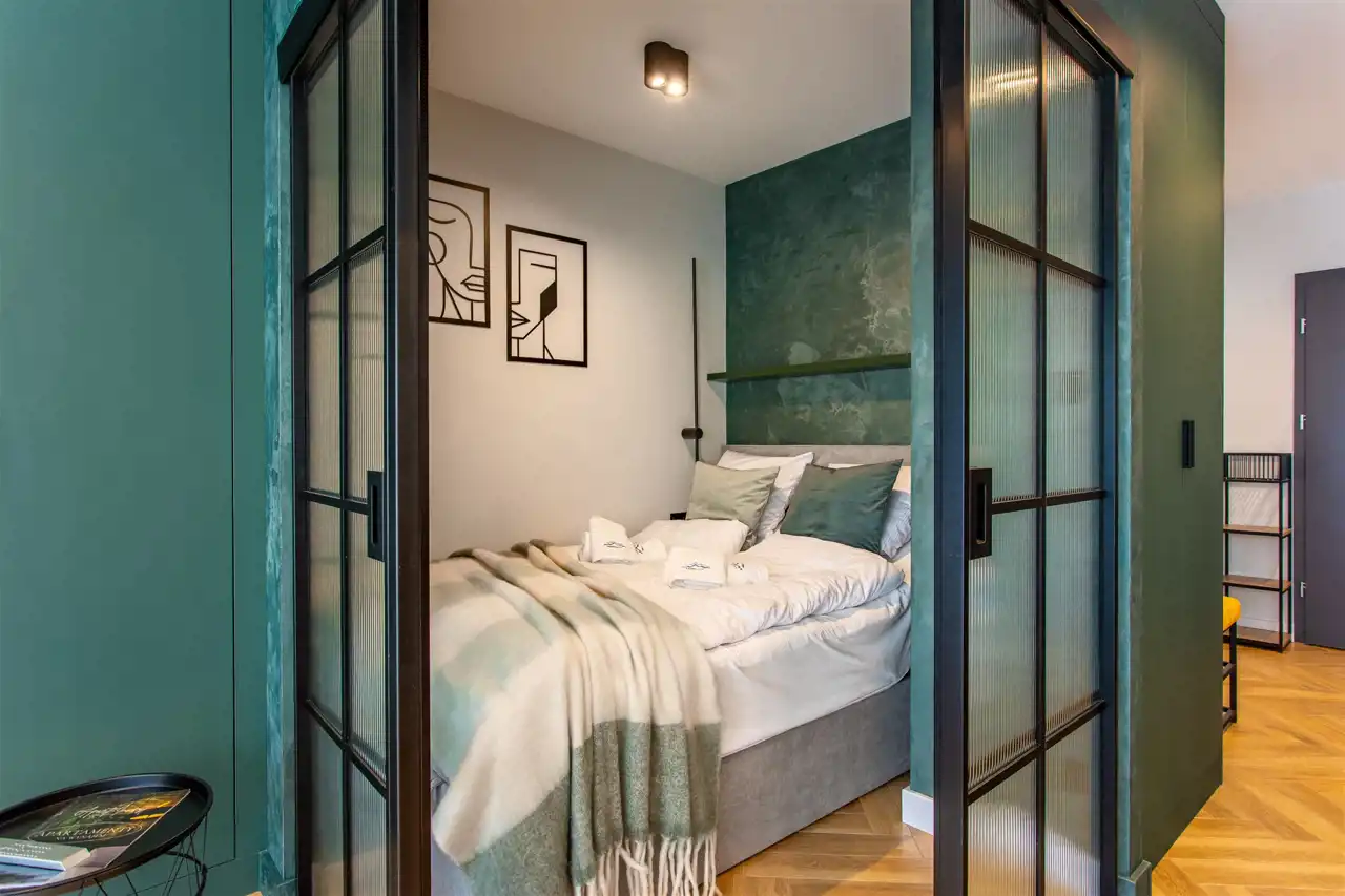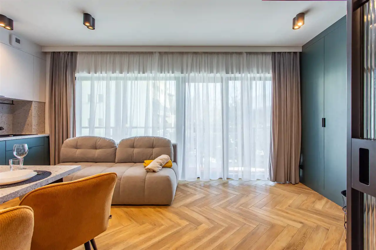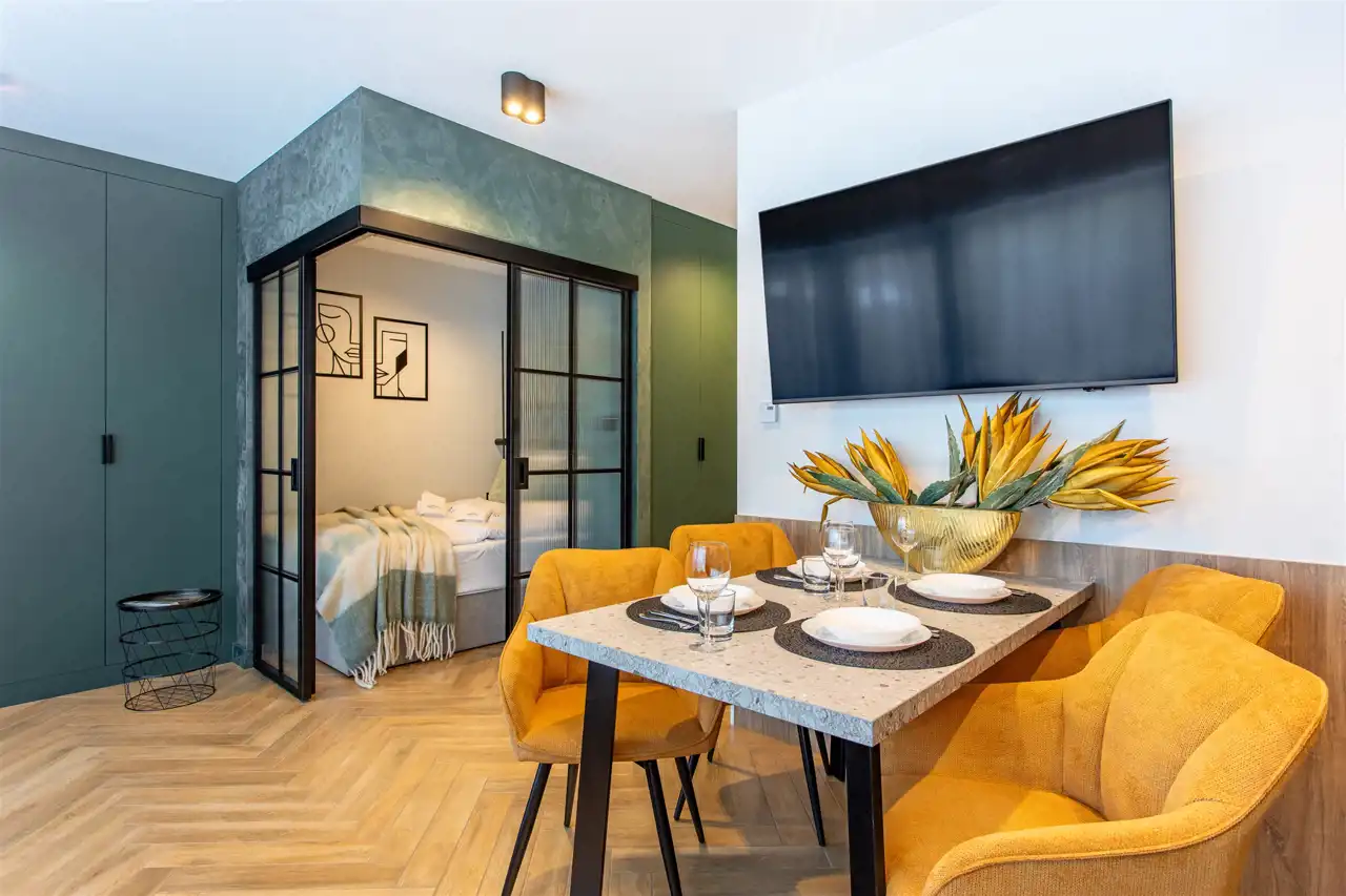 Lokal o powierzchni ponad 40 m² został wykończony z dbałością o detale, przy użyciu wysokiej klasy materiałów. Na funkcjonalną przestrzeń apartamentu składa się przestronny korytarz, duża sypialnia z balkonem, przemyślana łazienka oraz przestronny pokój dzienny z aneksem kuchennym i wyjściem na drugi balkon. Dzięki wygospodarowaniu dodatkowej, wydzielonej strefy sypialnianej w salonie, apartament może komfortowo pomieścić do 6 osób, co znacząco zwiększa jego potencjał inwestycyjny na tle standardowych lokali 2+2.