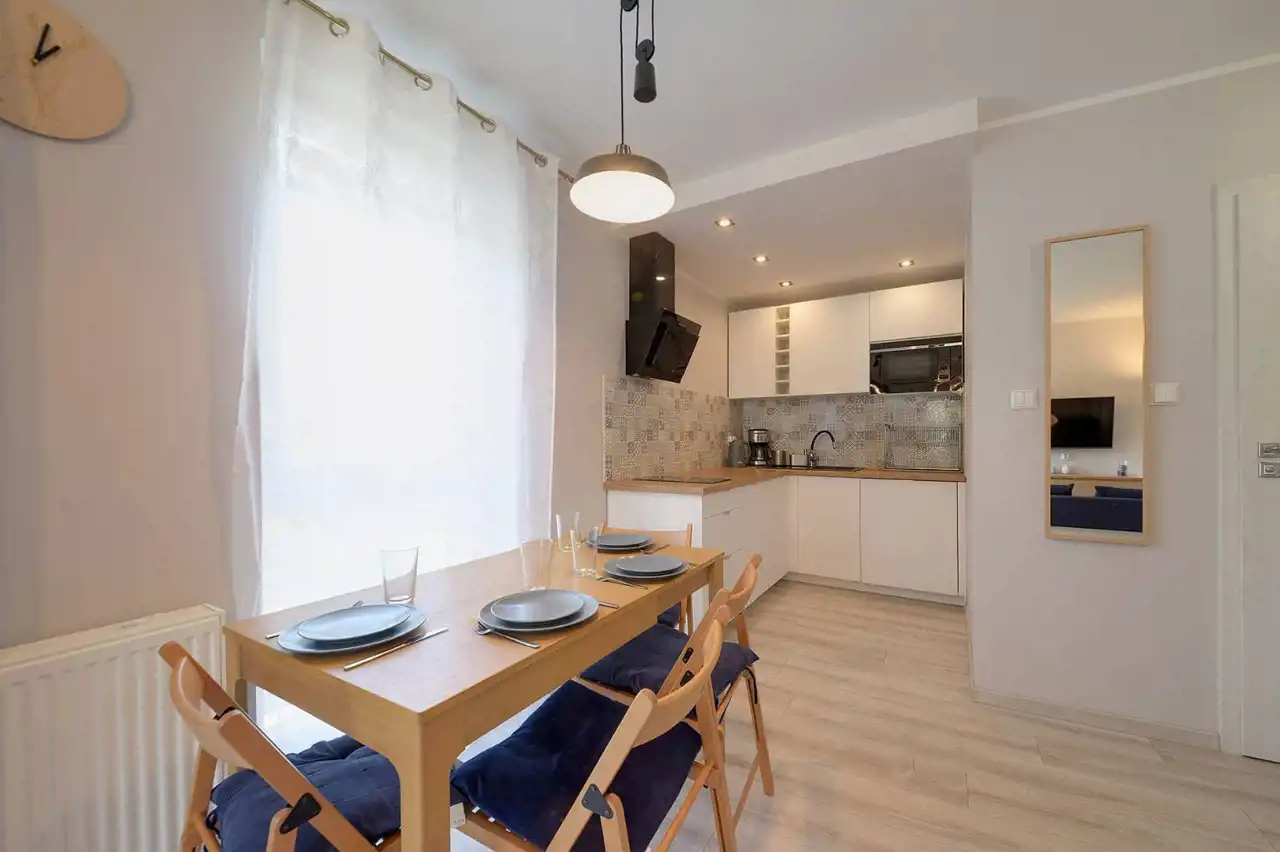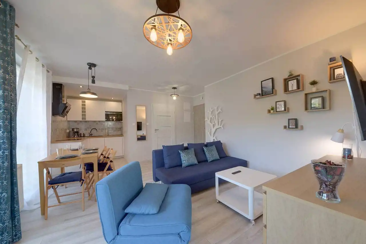 salon z aneksem kuchennym – w pełni wyposażona kuchnia (zabudowa, sprzęt AGD), wygodna sofa, stół z krzesłami, TV