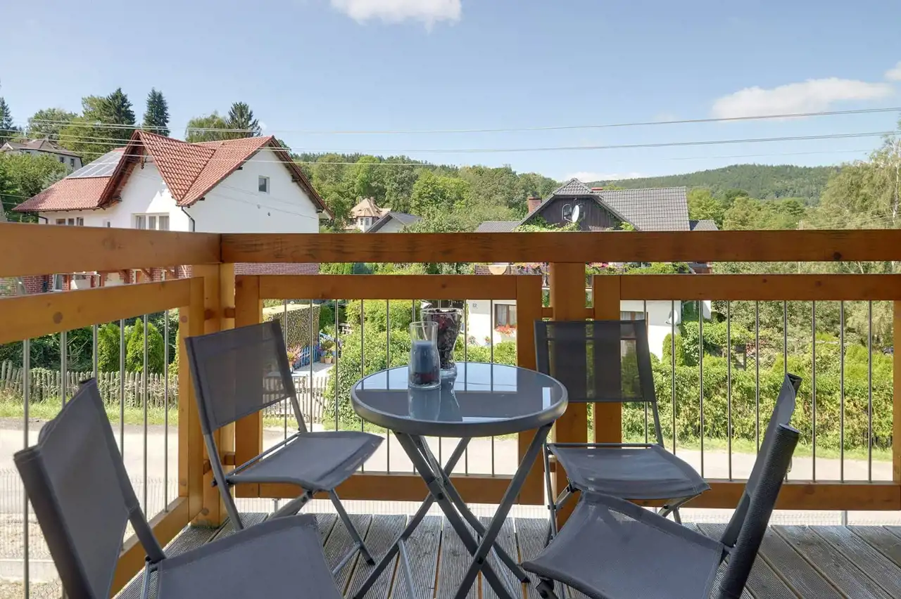 balkon z zestawem mebli – idealny na poranną kawę z widokiem na okoliczną zieleń