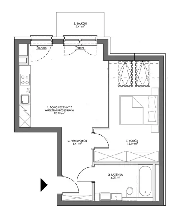 - Charakterystyka mieszkania 46.46 m2, 2 pokoje