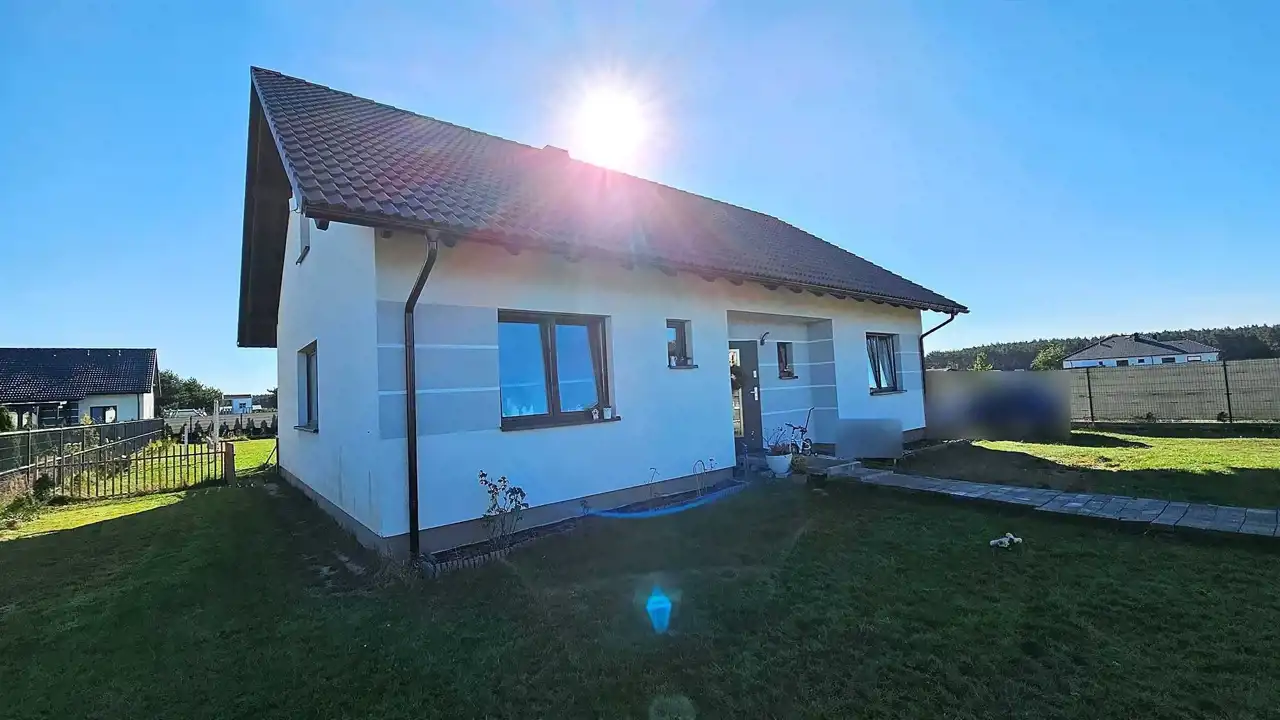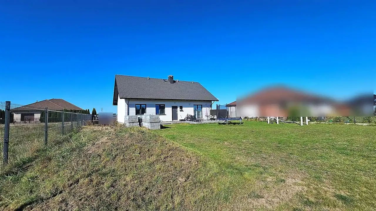BIURO NIERUCHOMOŚCI GLAM HOUSE gorąco poleca parterowy dom usytuowany na osiedlu domów w podbydgoskim Rynarzewie na działce o powierzchni 1022 m2, ogrodzonej (panele ogrodzeniowe + front z bloczków betonowych i paneli), brama automatyczna, wideofon. Zakupiona kostka brukowa Polbruk Ideo – kolor Nerino 6 cm oraz krawężniki na front działki – do własnej aranżacji.