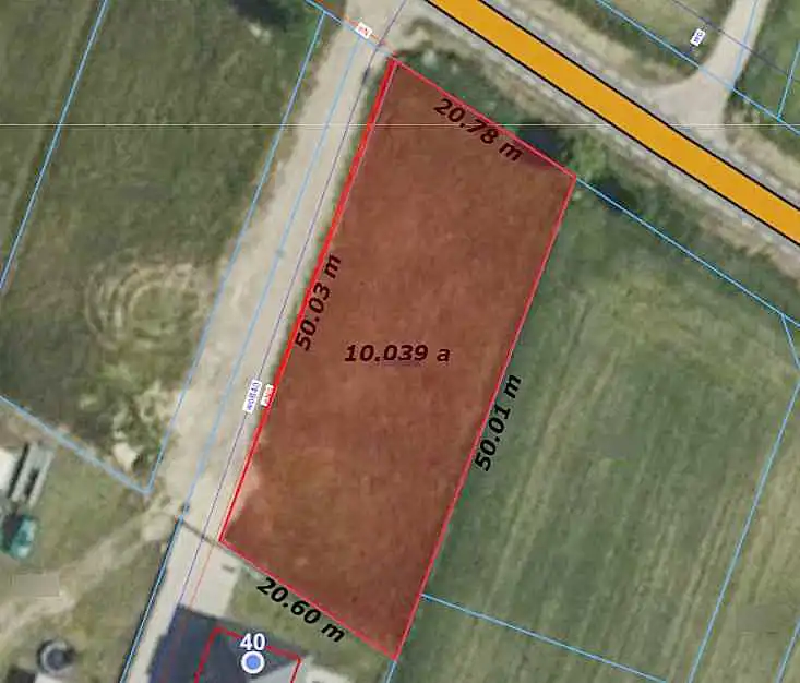 Ta ustawna działka o powierzchni 1045 m2 w kształcie prostokąta o wymiarach 50mx20m leży przy drodze asfaltowej i ma wydane warunki zabudowy na budowę budynku mieszkalnego jednorodzinnego.