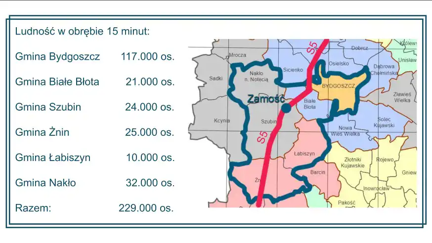 w niedalekiej odległości przy drodze DK5/E261. Pierwsza największa działka jej powierzchnia zabudowy to 6659 m2 , 450 mb wzdłuż drogi.Zamość w jego zasięgu najbliższe centa handlowe Bydgoszcz 26 km,Piła 80 km,Inowrocław 49 km,Gniezno 65 km.Jednocześnie działka z nową drogą posiada zasięg do Lisiego Ogona przez miejscowość Łochowo. W pobliżu projektowane osiedle wielorodzinne na około 360 mieszkań.
