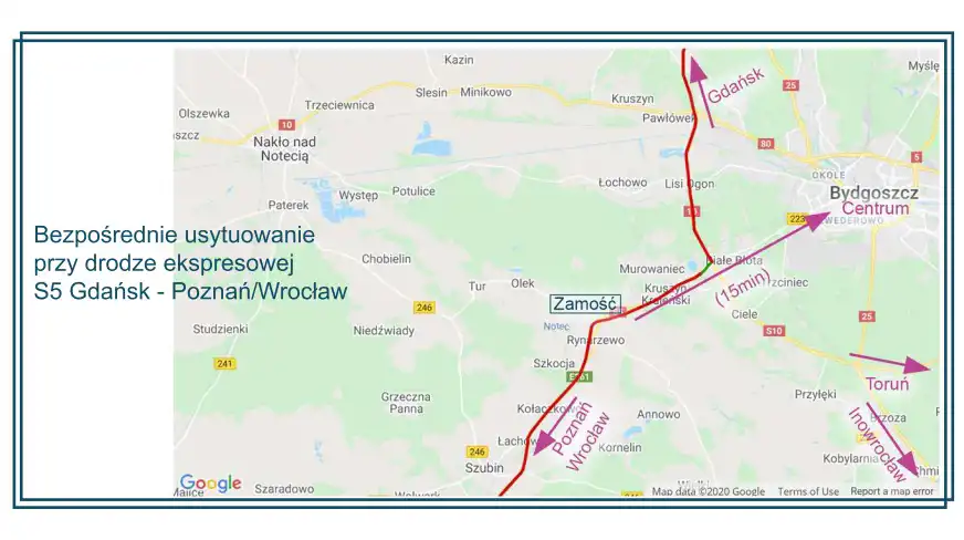 W ofercie sprzedaży posiadamy działki w Zamościu województwo kujawsko - pomorskie , które zlokalizowane są przy obwodnicy Bydgoszczy na drodze krajowej nr 5.W miejscowości znajduje się wjazd na trasę ekspresową S5(Gdańsk - Poznań/Wrocław oraz