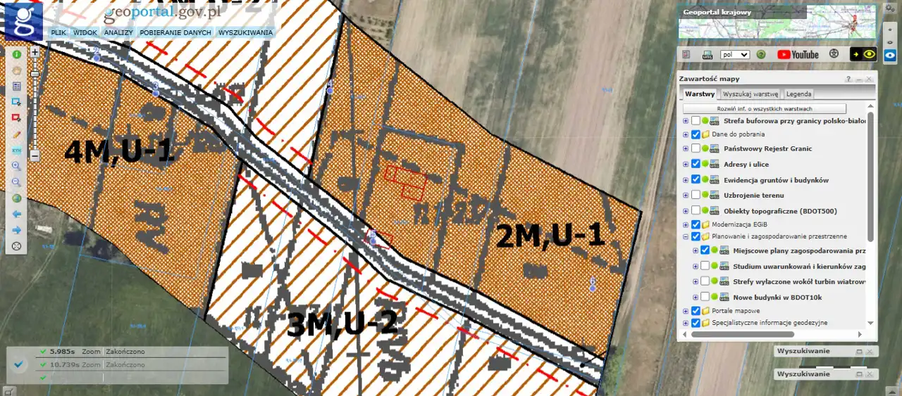 The entire plot is covered by the Local Spatial Development Plan: 2M,U-1 – areas for residential development and for the location of services or other non-intrusive economic activities on already developed or partially developed land.