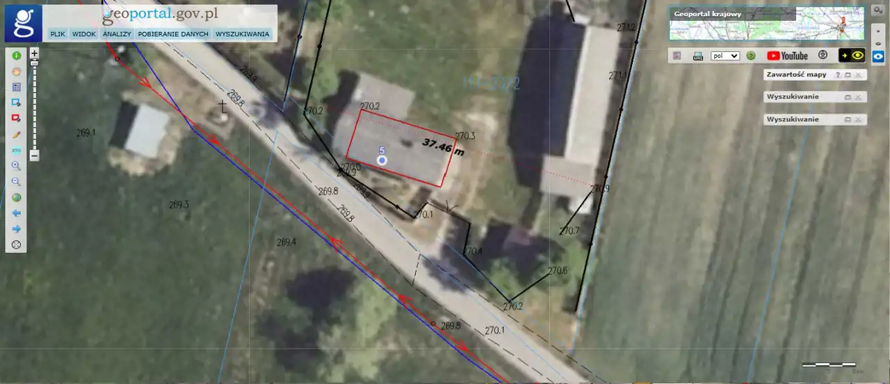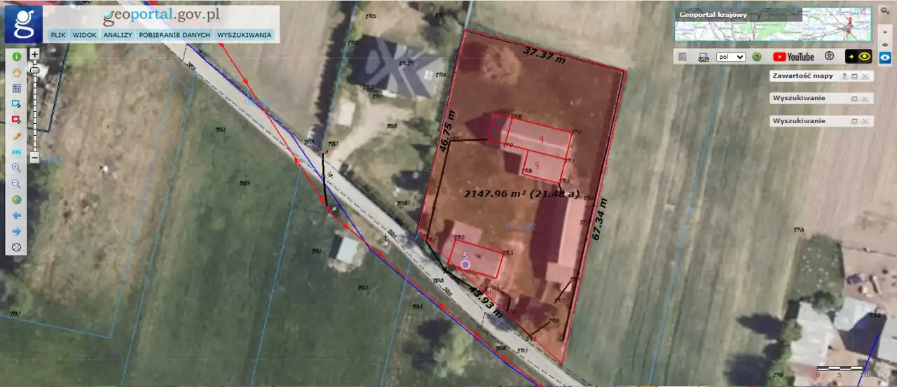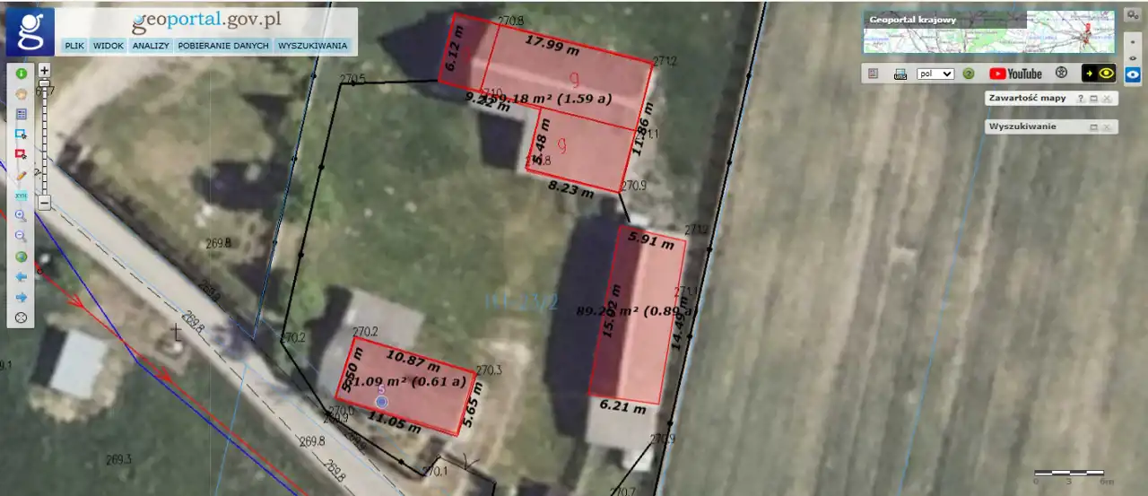 Powierzchnie budynków podane na podstawie wskazań geoportalu, mierzone po obrysie.