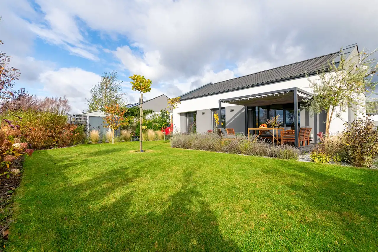 Ogród został zaplanowany tak, by zachwycał o każdej porze roku i zapewniał prywatność oraz przestrzeń do relaksu.