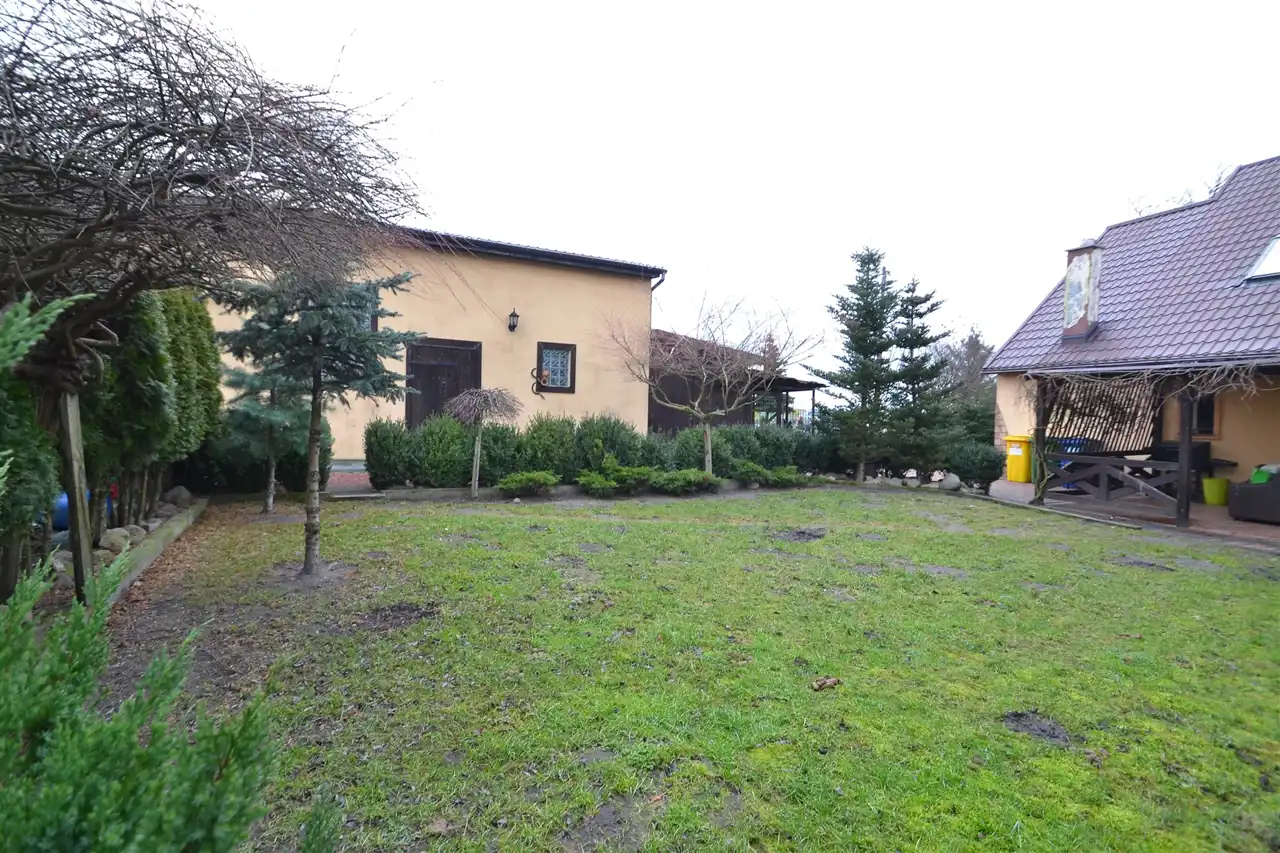 Ogród zagospodarowany licznymi nasadzeniami zieleni wysokiej i niskiej, podzielony na strefy wypoczynkową i użytkową. Dwa odrębne wjazdy na posesję wyłożone kostką brukową .