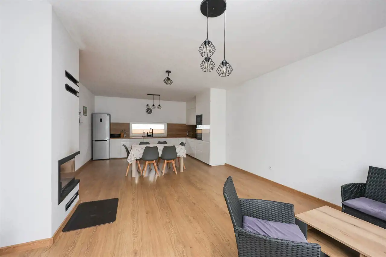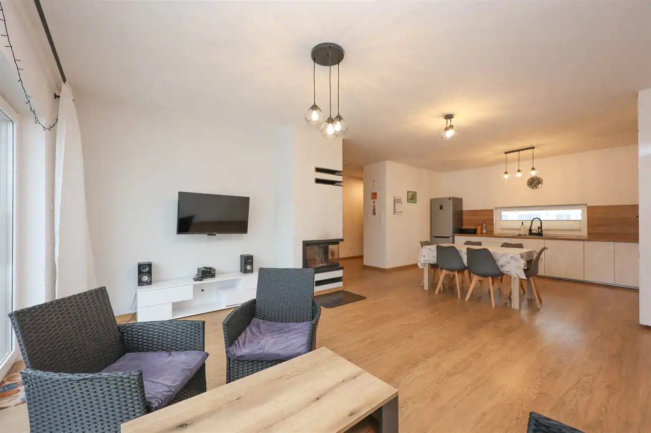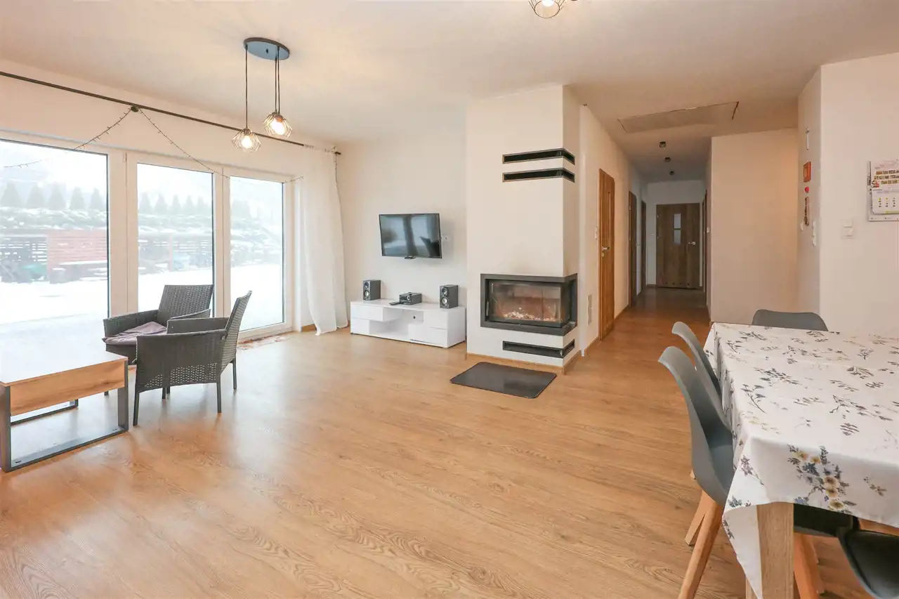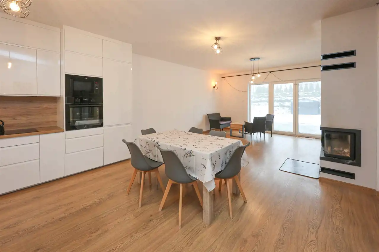 W salonie znajduje się funkcjonalny kominek, który doda ciepła w chłodniejsze dni i uatrakcyjni wieczorne pogawędki.