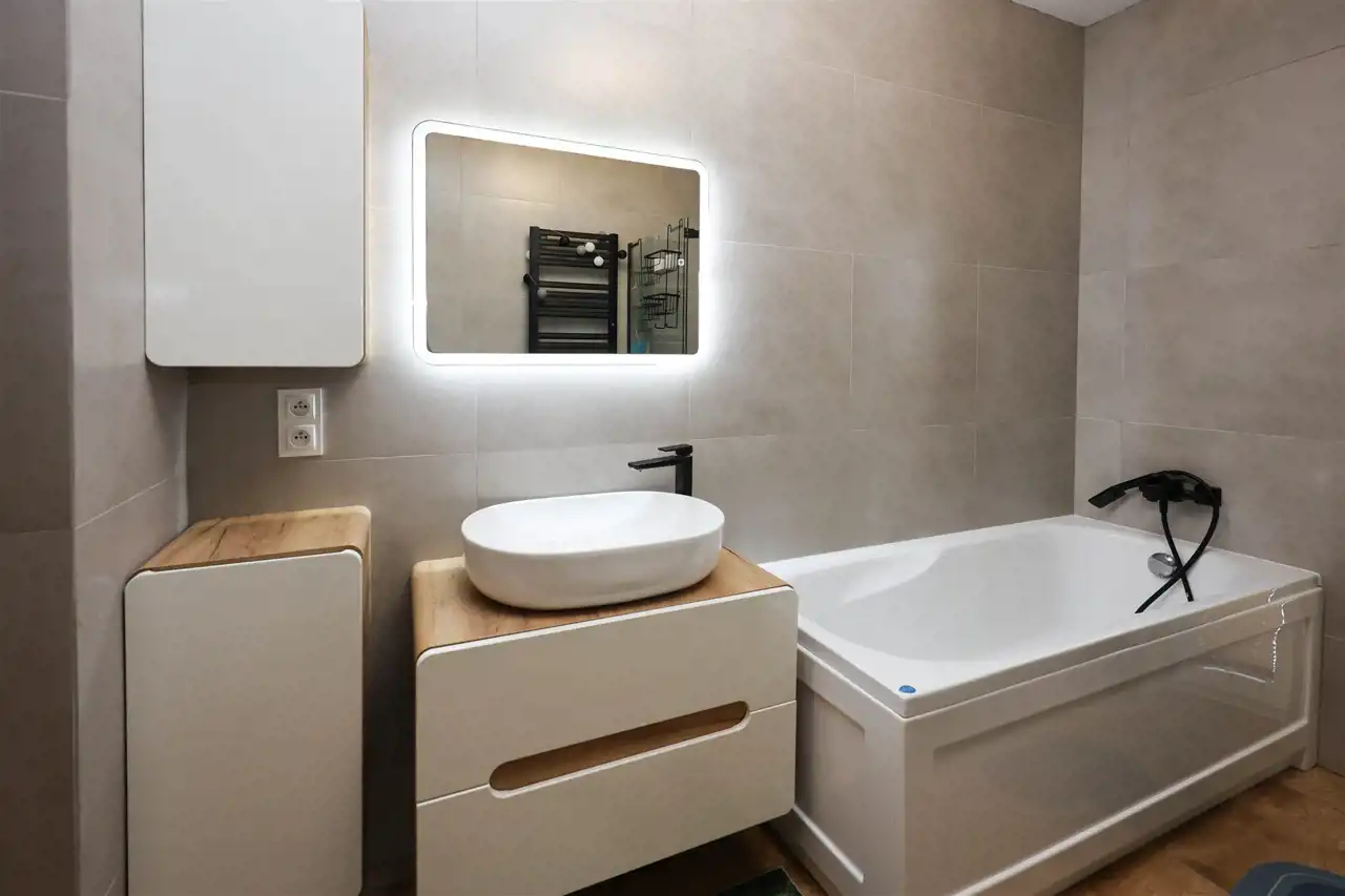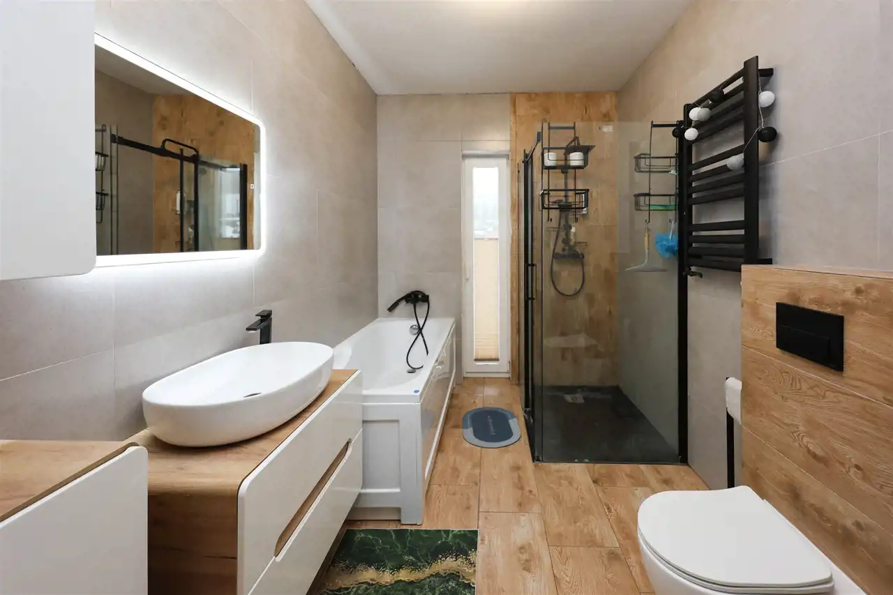 Łazienka o powierzchni 7,33m2 wyposażona w kabinę prysznicową, wannę, toaletę, umywalkę z lustrem i szafki.