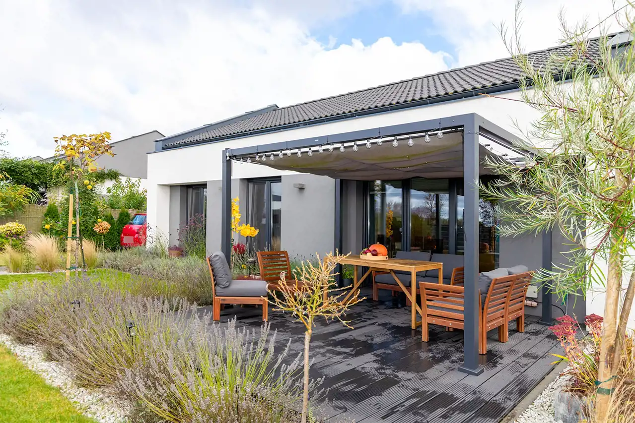- Taras z deski kompozytowej, częściowo zadaszony, z aluminiową konstrukcją, umożliwiającą regulację nasłonecznienia,