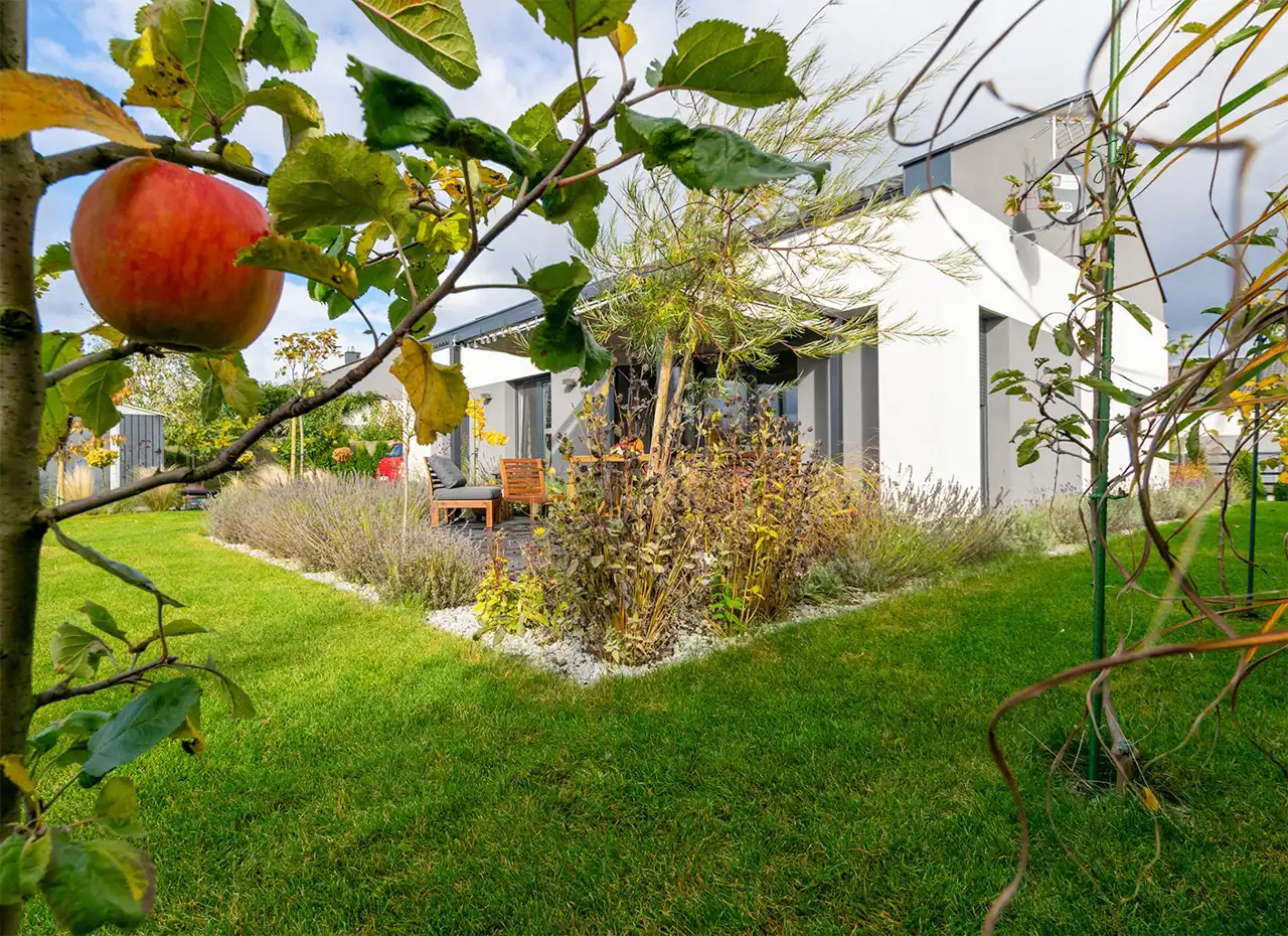 Ogród został zaplanowany tak, by zachwycał o każdej porze roku i zapewniał prywatność oraz przestrzeń do relaksu.