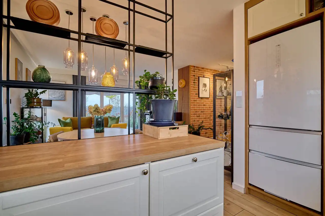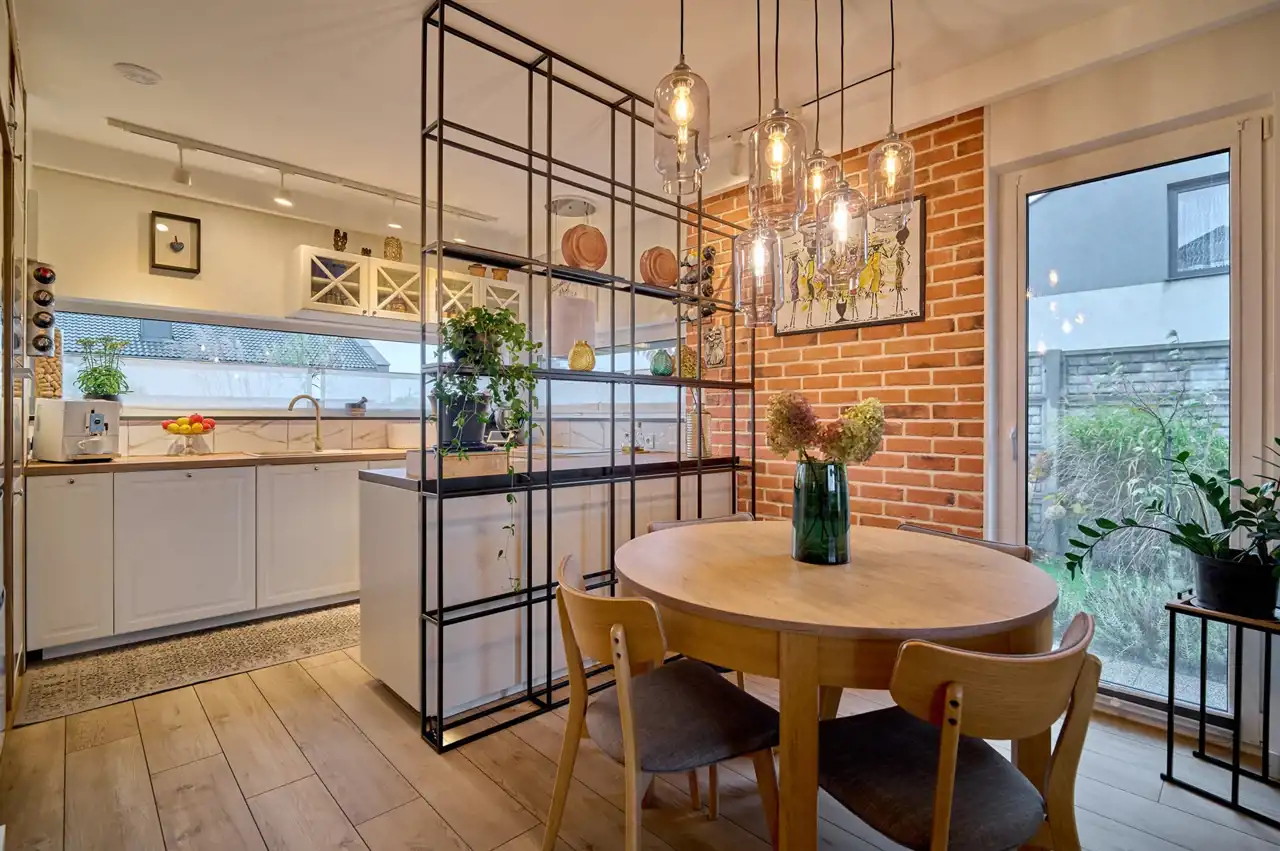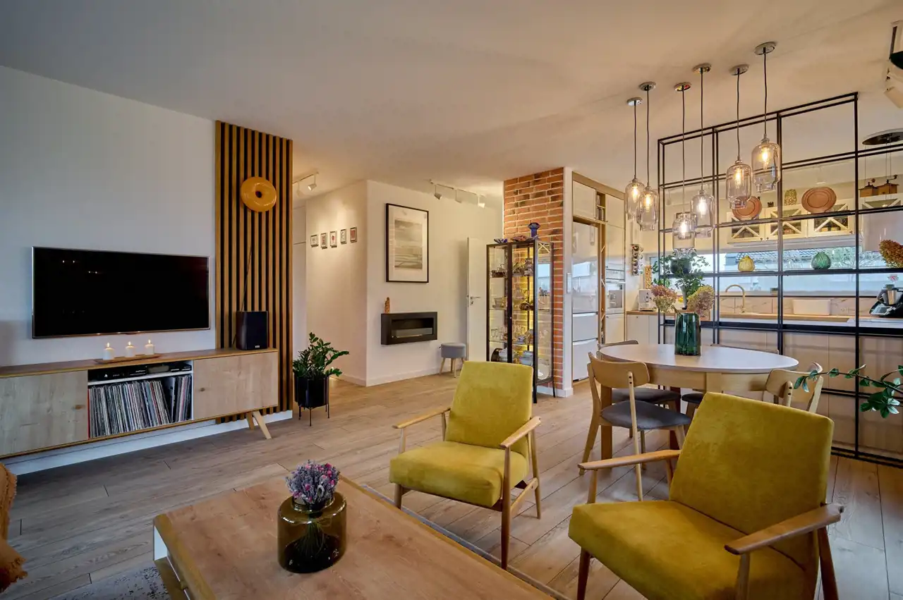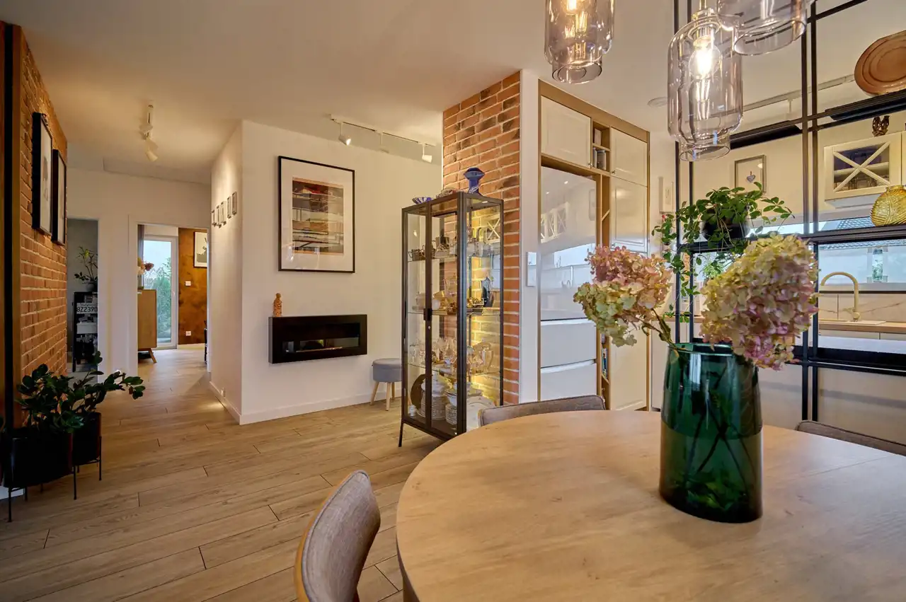 Całość utrzymana jest w spójnym, eleganckim stylu. Wnętrze zdobią ozdobne lamele, cegła oraz starannie dobrane oświetlenie.