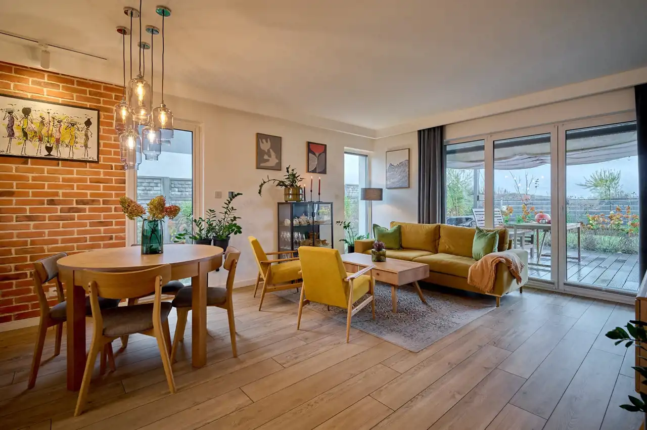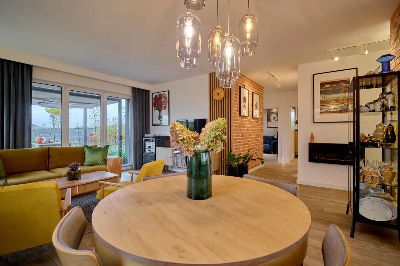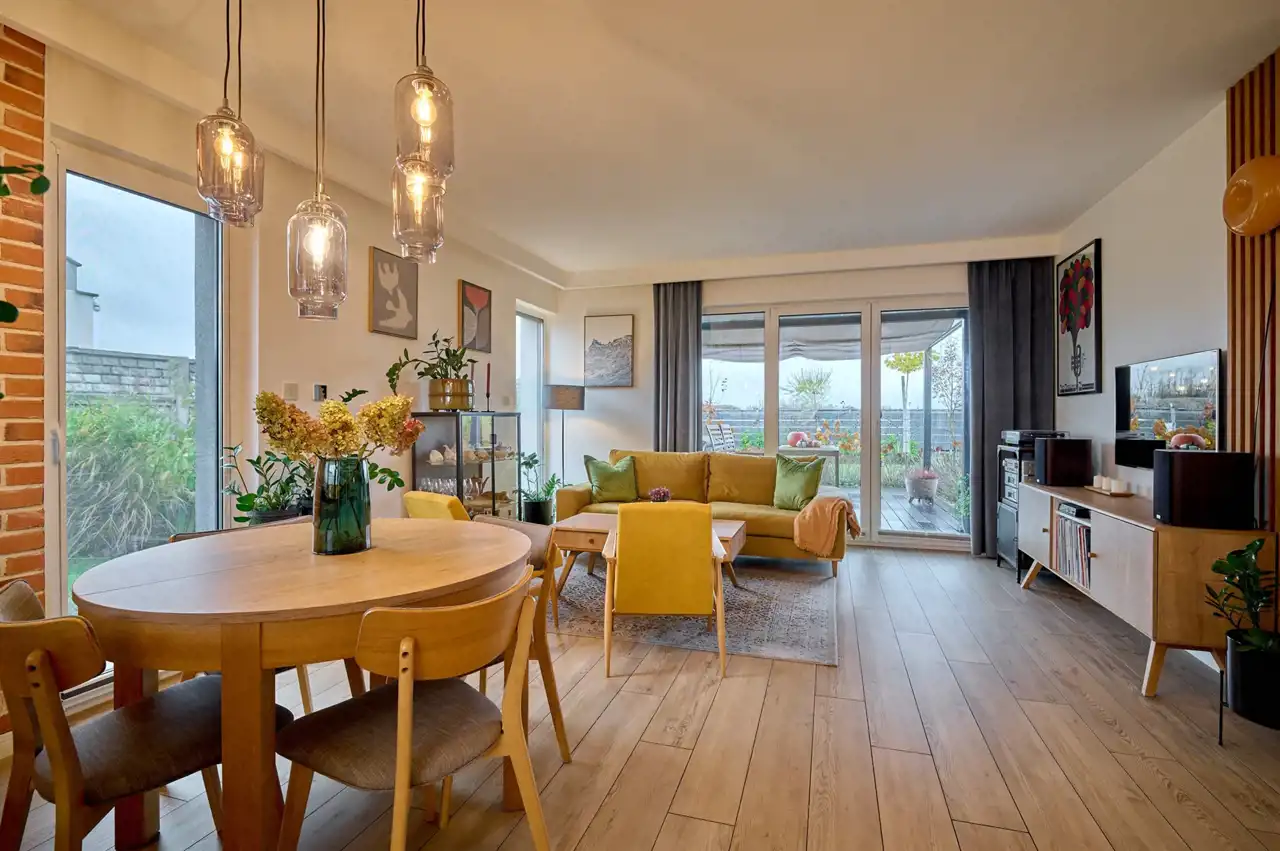 Przestronny salon (24,41 m2) połączony z jadalnią, z dużym przeszkleniem i wyjściem na taras, wyposażony w biokominek, (stół i krzesła widoczne na zdjęciu nie wchodzą w skład ceny)