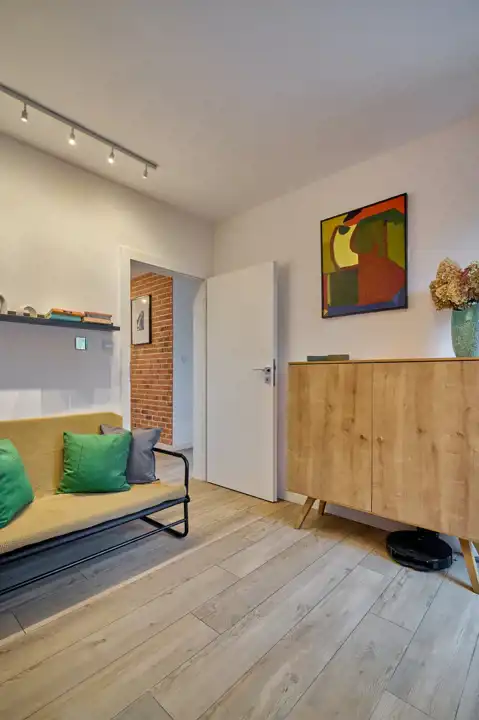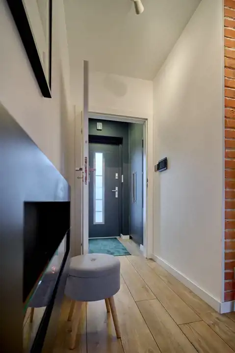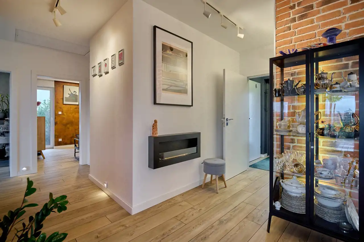 Komunikacja (9,39 m2) z cudowną ścianą ozdobioną cegłą i oświetleniem punktowym.