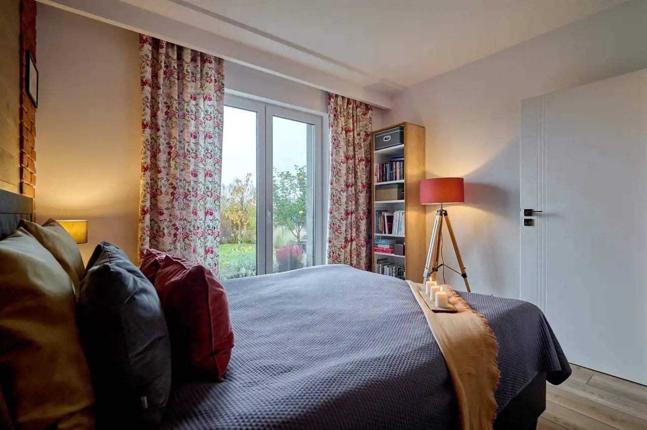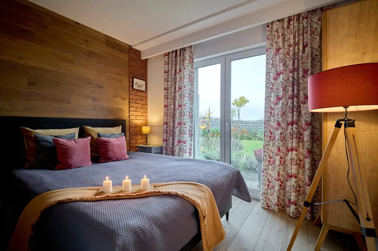 Sypialnia główna (10,10 m2) z wyjściem na ogród, łóżko sypialniane z tapicerowanym wezgłowiem i ścianą wykończoną naturalnym drewnem olejowanym oraz cegłą (łózko, materac, stolik w cenie)