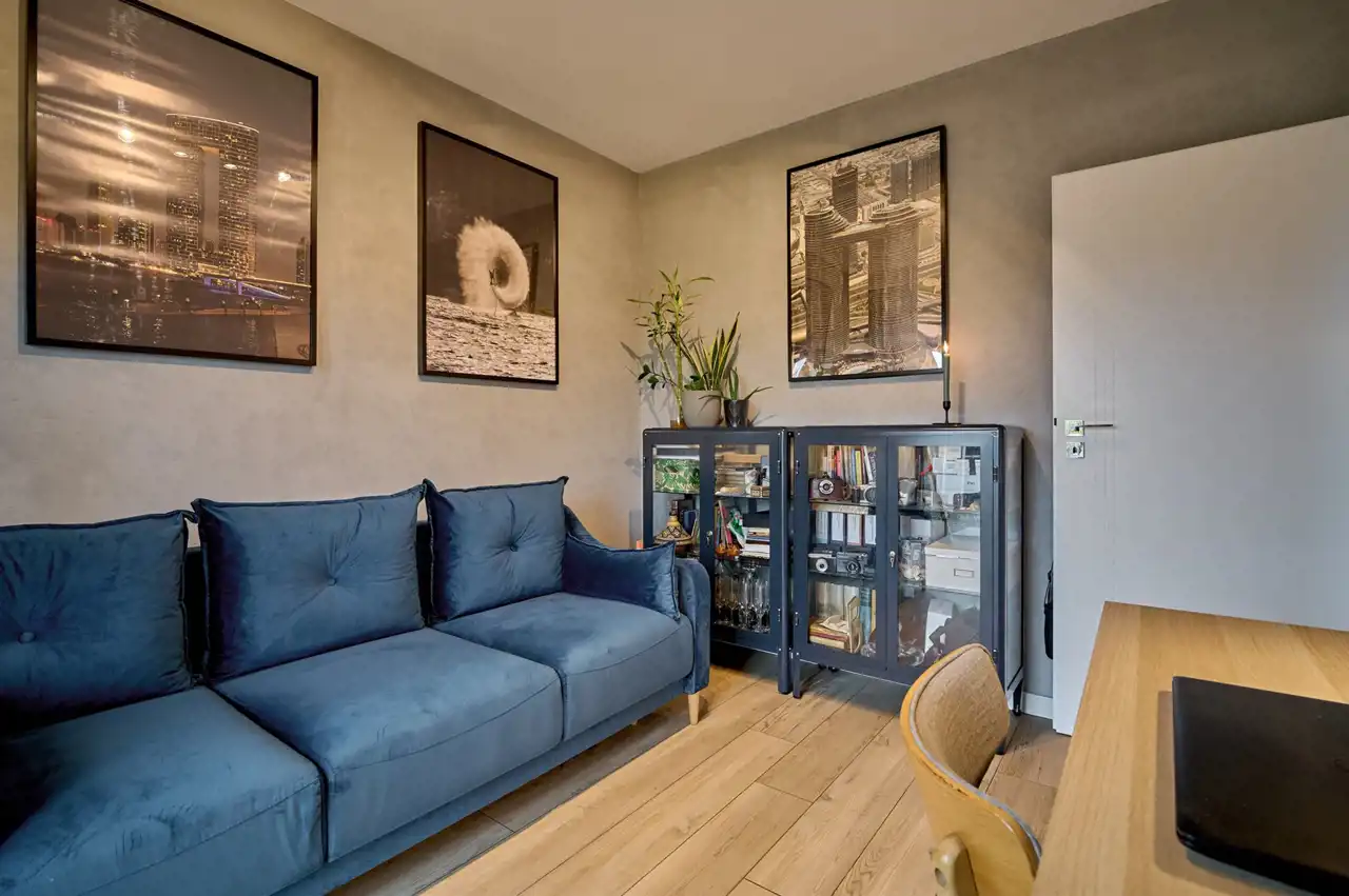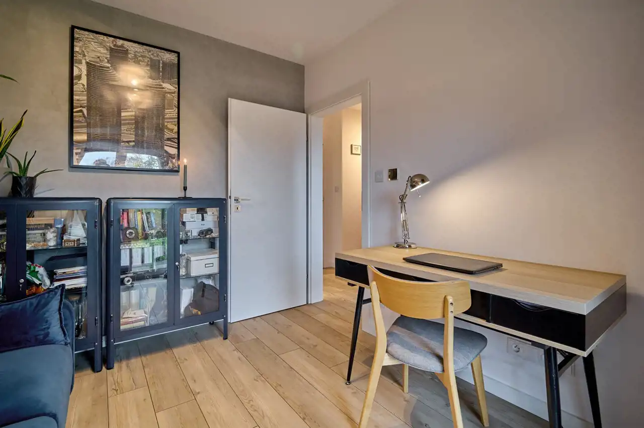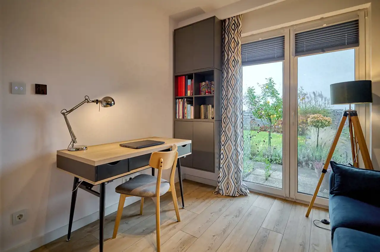 Gabinet (10,20 m2) z wyjściem na ogród, wyposażony w biurko, kanapę z funkcja spania, witryny, szafki wiszące i oświetlenie (wszytsko w cenie)